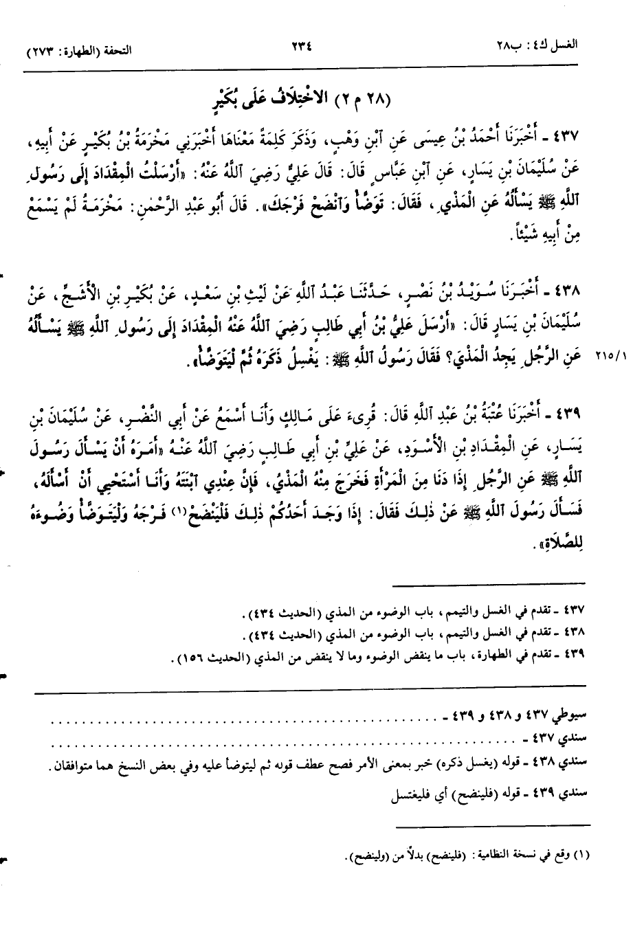 438 - أَخْبَرَنَا سُوَيْدُ بْنُ نَصْرٍ قَالَ أَنْبَأَنَا عَبْدُ اللَّهِ عَنْ لَيْثِ بْنِ سَعْدٍ عَنْ بُكَيْرِ بْنِ الْأَشَجِّ عَنْ سُلَيْمَانَ بْنِ يَسَارٍ قَالَ أَرْسَلَ عَلِيُّ بْنُ أَبِي طَالِبٍ رَضِيَ اللَّهُ عَنْهُ الْمِقْدَادَ إِلَى رَسُولِ اللَّهِ صَلَّى اللَّهُ عَلَيْهِ وَسَلَّمَ يَسْأَلُهُ عَنْ الرَّجُلِ يَجِدُ الْمَذْيَ فَقَالَ رَسُولُ اللَّهِ صَلَّى اللَّهُ عَلَيْهِ وَسَلَّمَ يَغْسِلُ ذَكَرَهُ ثُمَّ لِيَتَوَضَّأْ