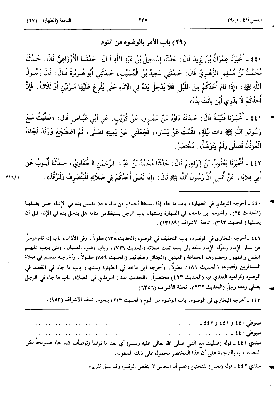 بَاب الْأَمْرِ بِالْوُضُوءِ مِنْ النَّوْمِ 440 - أَخْبَرَنَا عِمْرَانُ بْنُ يَزِيدَ قَالَ حَدَّثَنَا إِسْمَعِيلُ بْنُ عَبْدِ اللَّهِ قَالَ حَدَّثَنَا الْأَوْزَاعِيُّ قَالَ حَدَّثَنَا مُحَمَّدُ بْنُ مُسْلِمٍ الزُّهْرِيُّ قَالَ حَدَّثَنِي سَعِيدُ بْنُ الْمُسَيَّبِ قَالَ حَدَّثَنِي أَبُو هُرَيْرَةَ قَالَ قَالَ رَسُولُ اللَّهِ صَلَّى اللَّهُ عَلَيْهِ وَسَلَّمَ إِذَا قَامَ أَحَدُكُمْ مِنْ اللَّيْلِ فَلَا يُدْخِلْ يَدَهُ فِي الْإِنَاءِ حَتَّى يُفْرِغَ عَلَيْهَا مَرَّتَيْنِ أَوْ ثَلَاثًا فَإِنَّ أَحَدَكُمْ لَا يَدْرِي أَيْنَ بَاتَتْ يَدُهُ