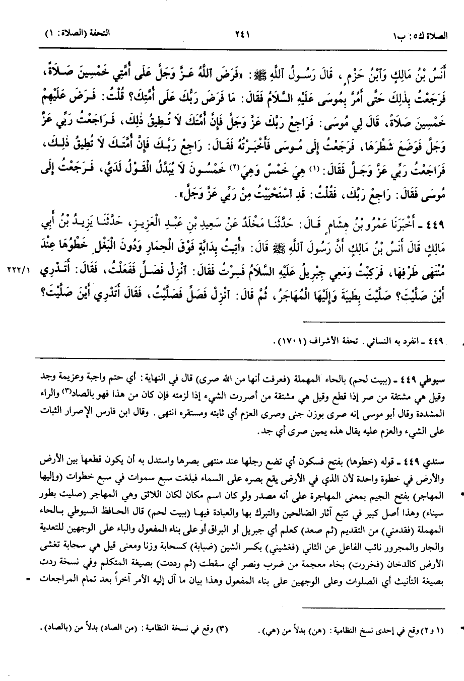 449 - أَخْبَرَنَا عَمْرُو بْنُ هِشَامٍ قَالَ حَدَّثَنَا مَخْلَدٌ عَنْ سَعِيدِ بْنِ عَبْدِ الْعَزِيزِ قَالَ حَدَّثَنَا يَزِيدُ بْنُ أَبِي مَالِكٍ قَالَ حَدَّثَنَا أَنَسُ بْنُ مَالِكٍ أَنَّ رَسُولَ اللَّهِ صَلَّى اللَّهُ عَلَيْهِ وَسَلَّمَ قَالَ أُتِيتُ بِدَابَّةٍ فَوْقَ الْحِمَارِ وَدُونَ الْبَغْلِ خَطْوُهَا عِنْدَ مُنْتَهَى طَرْفِهَا فَرَكِبْتُ وَمَعِي جِبْرِيلُ عَلَيْهِ السَّلَام فَسِرْتُ فَقَالَ انْزِلْ فَصَلِّ فَفَعَلْتُ فَقَالَ أَتَدْرِي أَيْنَ صَلَّيْتَ صَلَّيْتَ بِطَيْبَةَ وَإِلَيْهَا الْمُهَاجَرُ ثُمَّ قَالَ انْزِلْ فَصَلِّ فَصَلَّيْتُ فَقَالَ أَتَدْرِي أَيْنَ صَلَّيْتَ صَلَّيْتَ بِطُورِ سَيْنَاءَ حَيْثُ كَلَّمَ اللَّهُ عَزَّ وَجَلَّ مُوسَى عَلَيْهِ السَّلَام ثُمَّ قَالَ انْزِلْ فَصَلِّ فَنَزَلْتُ فَصَلَّيْتُ فَقَالَ أَتَدْرِي أَيْنَ صَلَّيْتَ صَلَّيْتَ بِبَيْتِ لَحْمٍ حَيْثُ وُلِدَ عِيسَى عَلَيْهِ السَّلَام ثُمَّ دَخَلْتُ بَيْتَ الْمَقْدِسِ فَجُمِعَ لِي الْأَنْبِيَاءُ عَلَيْهِمْ السَّلَام فَقَدَّمَنِي جِبْرِيلُ حَتَّى أَمَمْتُهُمْ ثُمَّ صُعِدَ بِي إِلَى السَّمَاءِ الدُّنْيَا فَإِذَا فِيهَا آدَمُ عَلَيْهِ السَّلَام ثُمَّ صُعِدَ بِي إِلَى السَّمَاءِ الثَّانِيَةِ فَإِذَا فِيهَا ابْنَا الْخَالَةِ عِيسَى وَيَحْيَى عَلَيْهِمَا السَّلَام ثُمَّ صُعِدَ بِي إِلَى السَّمَاءِ الثَّالِثَةِ فَإِذَا فِيهَا يُوسُفُ عَلَيْهِ السَّلَام ثُمَّ صُعِدَ بِي إِلَى السَّمَاءِ الرَّابِعَةِ فَإِذَا فِيهَا هَارُونُ عَلَيْهِ السَّلَام ثُمَّ صُعِدَ بِي إِلَى السَّمَاءِ الْخَامِسَةِ فَإِذَا فِيهَا إِدْرِيسُ عَلَيْهِ السَّلَام ثُمَّ صُعِدَ بِي إِلَى السَّمَاءِ السَّادِسَةِ فَإِذَا فِيهَا مُوسَى عَلَيْهِ السَّلَام ثُمَّ صُعِدَ بِي إِلَى السَّمَاءِ السَّابِعَةِ فَإِذَا فِيهَا إِبْرَاهِيمُ عَلَيْهِ السَّلَام ثُمَّ صُعِدَ بِي فَوْقَ سَبْعِ سَمَوَاتٍ فَأَتَيْنَا سِدْرَةَ الْمُنْتَهَى فَغَشِيَتْنِي ضَبَابَةٌ فَخَرَرْتُ سَاجِدًا فَقِيلَ لِي إِنِّي يَوْمَ خَلَقْتُ السَّمَوَاتِ وَالْأَرْضَ فَرَضْتُ عَلَيْكَ وَعَلَى أُمَّتِكَ خَمْسِينَ صَلَاةً فَقُمْ بِهَا أَنْتَ وَأُمَّتُكَ فَرَجَعْتُ إِلَى إِبْرَاهِيمَ فَلَمْ يَسْأَلْنِي عَنْ شَيْءٍ ثُمَّ أَتَيْتُ عَلَى مُوسَى فَقَالَ كَمْ فَرَضَ اللَّهُ عَلَيْكَ وَعَلَى أُمَّتِكَ قُلْتُ خَمْسِينَ صَلَاةً قَالَ فَإِنَّكَ لَا تَسْتَطِيعُ أَنْ تَقُومَ بِهَا أَنْتَ وَلَا أُمَّتُكَ فَارْجِعْ إِلَى رَبِّكَ فَاسْأَلْهُ التَّخْفِيفَ فَرَجَعْتُ إِلَى رَبِّي فَخَفَّفَ عَنِّي عَشْرًا ثُمَّ أَتَيْتُ مُوسَى فَأَمَرَنِي بِالرُّجُوعِ فَرَجَعْتُ فَخَفَّفَ عَنِّي عَشْرًا ثُمَّ رُدَّتْ إِلَى خَمْسِ صَلَوَاتٍ قَالَ فَارْجِعْ إِلَى رَبِّكَ فَاسْأَلْهُ التَّخْفِيفَ فَإِنَّهُ فَرَضَ عَلَى بَنِي إِسْرَائِيلَ صَلَاتَيْنِ فَمَا قَامُوا بِهِمَا فَرَجَعْتُ إِلَى رَبِّي عَزَّ وَجَلَّ فَسَأَلْتُهُ التَّخْفِيفَ فَقَالَ إِنِّي يَوْمَ خَلَقْتُ السَّمَوَاتِ وَالْأَرْضَ فَرَضْتُ عَلَيْكَ وَعَلَى أُمَّتِكَ خَمْسِينَ صَلَاةً فَخَمْسٌ بِخَمْسِينَ فَقُمْ بِهَا أَنْتَ وَأُمَّتُكَ فَعَرَفْتُ أَنَّهَا مِنْ اللَّهِ تَبَارَكَ وَتَعَالَى صِرَّى فَرَجَعْتُ إِلَى مُوسَى عَلَيْهِ السَّلَام فَقَالَ ارْجِعْ فَعَرَفْتُ أَنَّهَا مِنْ اللَّهِ صِرَّى أَيْ حَتْمٌ فَلَمْ أَرْجِعْ
