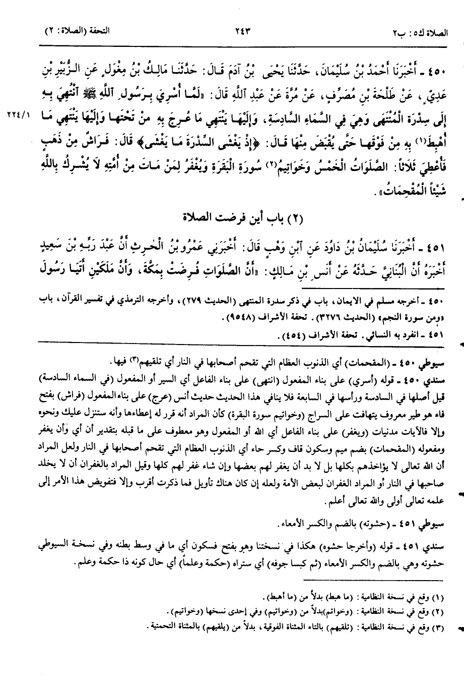 450 - أَخْبَرَنَا أَحْمَدُ بْنُ سُلَيْمَانَ قَالَ حَدَّثَنَا يَحْيَى بْنُ آدَمَ قَالَ حَدَّثَنَا مَالِكُ بْنُ مِغْوَلٍ عَنْ الزُّبَيْرِ بْنِ عَدِيٍّ عَنْ طَلْحَةَ بْنِ مُصَرِّفٍ عَنْ مُرَّةَ عَنْ عَبْدِ اللَّهِ قَالَ لَمَّا أُسْرِيَ بِرَسُولِ اللَّهِ صَلَّى اللَّهُ عَلَيْهِ وَسَلَّمَ انْتُهِيَ بِهِ إِلَى سِدْرَةِ الْمُنْتَهَى وَهِيَ فِي السَّمَاءِ السَّادِسَةِ وَإِلَيْهَا يَنْتَهِي مَا عُرِجَ بِهِ مِنْ تَحْتِهَا وَإِلَيْهَا يَنْتَهِي مَا أُهْبِطَ بِهِ مِنْ فَوْقِهَا حَتَّى يُقْبَضَ مِنْهَا قَالَ { إِذْ يَغْشَى السِّدْرَةَ مَا يَغْشَى } قَالَ فَرَاشٌ مِنْ ذَهَبٍ فَأُعْطِيَ ثَلَاثًا الصَّلَوَاتُ الْخَمْسُ وَخَوَاتِيمُ سُورَةِ الْبَقَرَةِ وَيُغْفَرُ لِمَنْ مَاتَ مِنْ أُمَّتِهِ لَا يُشْرِكُ بِاللَّهِ شَيْئًا الْمُقْحِمَاتُ