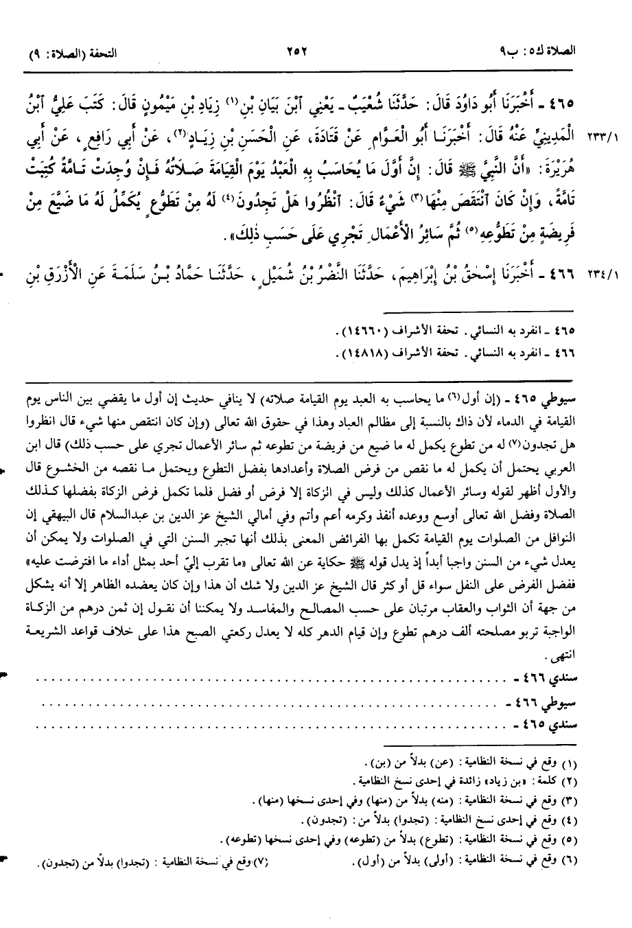 466 - أَخْبَرَنَا إِسْحَقُ بْنُ إِبْرَاهِيمَ قَالَ حَدَّثَنَا النَّضْرُ بْنُ شُمَيْلٍ قَالَ أَنْبَأَنَا حَمَّادُ بْنُ سَلَمَةَ عَنْ الْأَزْرَقِ بْنِ قَيْسٍ عَنْ يَحْيَى بْنِ يَعْمَرَ عَنْ أَبِي هُرَيْرَةَ عَنْ رَسُولِ اللَّهِ صَلَّى اللَّهُ عَلَيْهِ وَسَلَّمَ قَالَ أَوَّلُ مَا يُحَاسَبُ بِهِ الْعَبْدُ صَلَاتُهُ فَإِنْ كَانَ أَكْمَلَهَا وَإِلَّا قَالَ اللَّهُ عَزَّ وَجَلَّ انْظُرُوا لِعَبْدِي مِنْ تَطَوُّعٍ فَإِنْ وُجِدَ لَهُ تَطَوُّعٌ قَالَ أَكْمِلُوا بِهِ الْفَرِيضَةَ