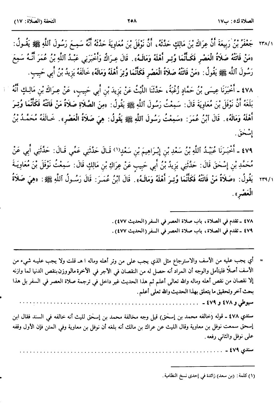 478 - أَخْبَرَنَا عِيسَى بْنُ حَمَّادٍ زُغْبَةُ قَالَ حَدَّثَنَا اللَّيْثُ عَنْ يَزِيدَ بْنِ أَبِي حَبِيبٍ عَنْ عِرَاكِ بْنِ مَالِكٍ أَنَّهُ بَلَغَهُ أَنَّ نَوْفَلَ بْنَ مُعَاوِيَةَ قَالَ سَمِعْتُ رَسُولَ اللَّهِ صَلَّى اللَّهُ عَلَيْهِ وَسَلَّمَ يَقُولُ مِنْ الصَّلَاةِ صَلَاةٌ مَنْ فَاتَتْهُ فَكَأَنَّمَا وُتِرَ أَهْلَهُ وَمَالَهُ قَالَ ابْنُ عُمَرَ سَمِعْتُ رَسُولَ اللَّهِ صَلَّى اللَّهُ عَلَيْهِ وَسَلَّمَ يَقُولُ هِيَ صَلَاةُ الْعَصْرِ خَالَفَهُ مُحَمَّدُ بْنُ إِسْحَقَ