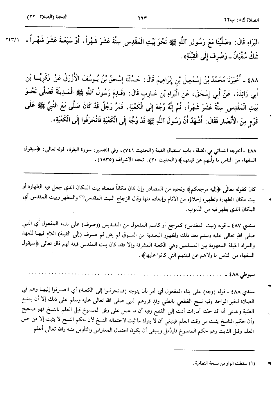 488 - أَخْبَرَنَا مُحَمَّدُ بْنُ إِسْمَعِيلَ بْنِ إِبْرَاهِيمَ قَالَ حَدَّثَنَا إِسْحَقُ بْنُ يُوسُفَ الْأَزْرَقُ عَنْ زَكَرِيَّا بْنِ أَبِي زَائِدَةَ عَنْ أَبِي إِسْحَقَ عَنْ الْبَرَاءِ بْنِ عَازِبٍ قَالَ قَدِمَ رَسُولُ اللَّهِ صَلَّى اللَّهُ عَلَيْهِ وَسَلَّمَ الْمَدِينَةَ فَصَلَّى نَحْوَ بَيْتِ الْمَقْدِسِ سِتَّةَ عَشَرَ شَهْرًا ثُمَّ إِنَّهُ وُجِّهَ إِلَى الْكَعْبَةِ فَمَرَّ رَجُلٌ قَدْ كَانَ صَلَّى مَعَ النَّبِيِّ صَلَّى اللَّهُ عَلَيْهِ وَسَلَّمَ عَلَى قَوْمٍ مِنْ الْأَنْصَارِ فَقَالَ أَشْهَدُ أَنَّ رَسُولَ اللَّهِ صَلَّى اللَّهُ عَلَيْهِ وَسَلَّمَ قَدْ وُجِّهَ إِلَى الْكَعْبَةِ فَانْحَرَفُوا إِلَى الْكَعْبَةِ