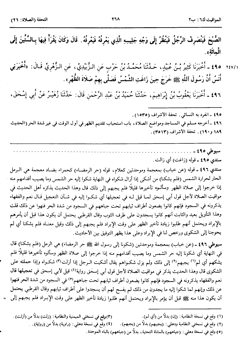 496 - أَخْبَرَنَا يَعْقُوبُ بْنُ إِبْرَاهِيمَ قَالَ حَدَّثَنَا حُمَيْدُ بْنُ عَبْدِ الرَّحْمَنِ قَالَ حَدَّثَنَا زُهَيْرٌ عَنْ أَبِي إِسْحَقَ عَنْ سَعِيدِ بْنِ وَهْبٍ عَنْ خَبَّابٍ قَالَ شَكَوْنَا إِلَى رَسُولِ اللَّهِ صَلَّى اللَّهُ عَلَيْهِ وَسَلَّمَ حَرَّ الرَّمْضَاءِ فَلَمْ يُشْكِنَا قِيلَ لِأَبِي إِسْحَقَ فِي تَعْجِيلِهَا قَالَ نَعَمْ