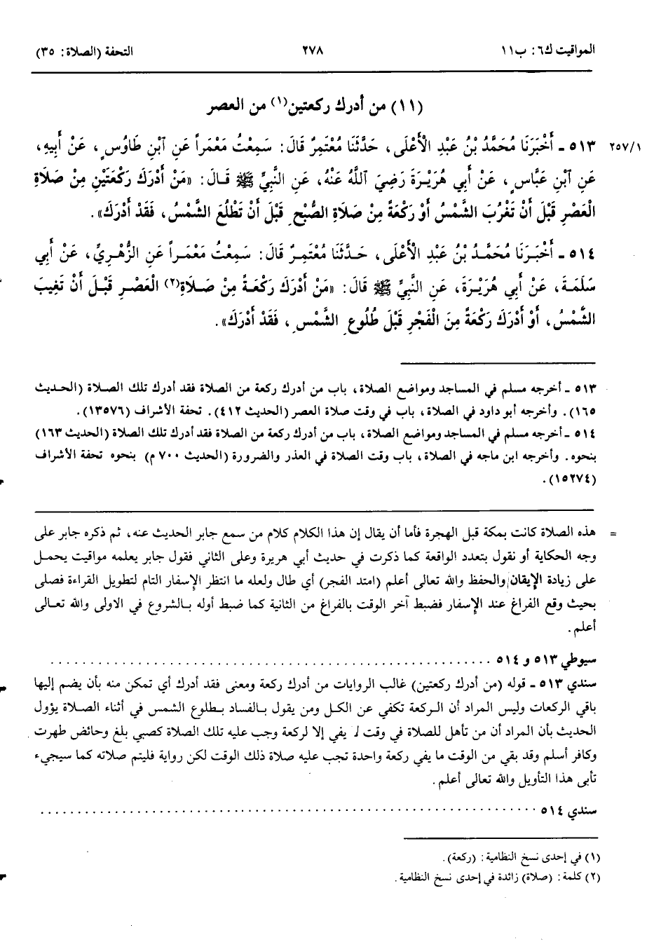 مَنْ أَدْرَكَ رَكْعَتَيْنِ مِنْ الْعَصْرِ 513 - أَخْبَرَنَا مُحَمَّدُ بْنُ عَبْدِ الْأَعْلَى قَالَ حَدَّثَنَا مُعْتَمِرٌ قَالَ سَمِعْتُ مَعْمَرًا عَنْ ابْنِ طَاوُسٍ عَنْ أَبِيهِ عَنْ ابْنِ عَبَّاسٍ عَنْ أَبِي هُرَيْرَةَ رَضِيَ اللَّهُ عَنْهُ عَنْ النَّبِيِّ صَلَّى اللَّهُ عَلَيْهِ وَسَلَّمَ قَالَ مَنْ أَدْرَكَ رَكْعَتَيْنِ مِنْ صَلَاةِ الْعَصْرِ قَبْلَ أَنْ تَغْرُبَ الشَّمْسُ أَوْ رَكْعَةً مِنْ صَلَاةِ الصُّبْحِ قَبْلَ أَنْ تَطْلُعَ الشَّمْسُ فَقَدْ أَدْرَكَ
