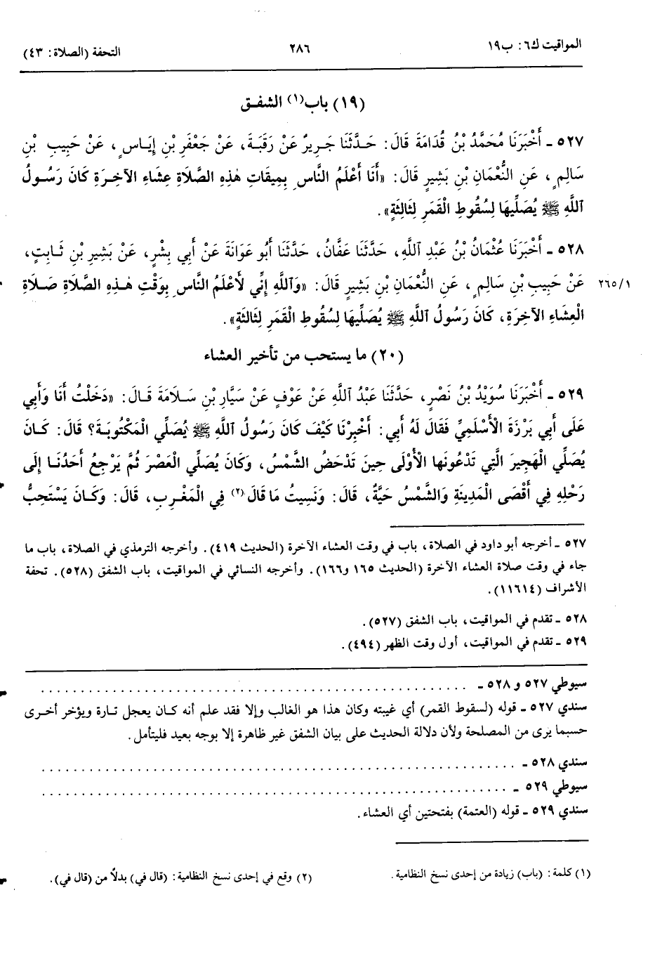 الشَّفَقُ 527 - أَخْبَرَنَا مُحَمَّدُ بْنُ قُدَامَةَ قَالَ حَدَّثَنَا جَرِيرٌ عَنْ رَقَبَةَ عَنْ جَعْفَرِ بْنِ إِيَاسٍ عَنْ حَبِيبِ بْنِ سَالِمٍ عَنْ النُّعْمَانِ بْنِ بَشِيرٍ قَالَ أَنَا أَعْلَمُ النَّاسِ بِمِيقَاتِ هَذِهِ الصَّلَاةِ عِشَاءِ الْآخِرَةِ كَانَ رَسُولُ اللَّهِ صَلَّى اللَّهُ عَلَيْهِ وَسَلَّمَ يُصَلِّيهَا لِسُقُوطِ الْقَمَرِ لِثَالِثَةٍ