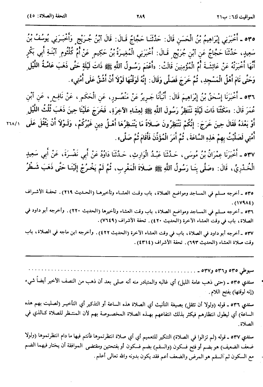 535 - أَخْبَرَنِي إِبْرَاهِيمُ بْنُ الْحَسَنِ قَالَ حَدَّثَنَا حَجَّاجٌ قَالَ قَالَ ابْنُ جُرَيْجٍ ح و أَخْبَرَنِي يُوسُفُ بْنُ سَعِيدٍ قَالَ حَدَّثَنَا حَجَّاجٌ عَنْ ابْنِ جُرَيْجٍ قَالَ أَخْبَرَنِي الْمُغِيرَةُ بْنُ حَكِيمٍ عَنْ أُمِّ كُلْثُومِ ابْنَةِ أَبِي بَكْرٍ أَنَّهَا أَخْبَرَتْهُ عَنْ عَائِشَةَ أُمِّ الْمُؤْمِنِينَ قَالَتْ أَعْتَمَ النَّبِيُّ صَلَّى اللَّهُ عَلَيْهِ وَسَلَّمَ ذَاتَ لَيْلَةٍ حَتَّى ذَهَبَ عَامَّةُ اللَّيْلِ وَحَتَّى نَامَ أَهْلُ الْمَسْجِدِ ثُمَّ خَرَجَ فَصَلَّى وَقَالَ إِنَّهُ لَوَقْتُهَا لَوْلَا أَنْ أَشُقَّ عَلَى أُمَّتِي