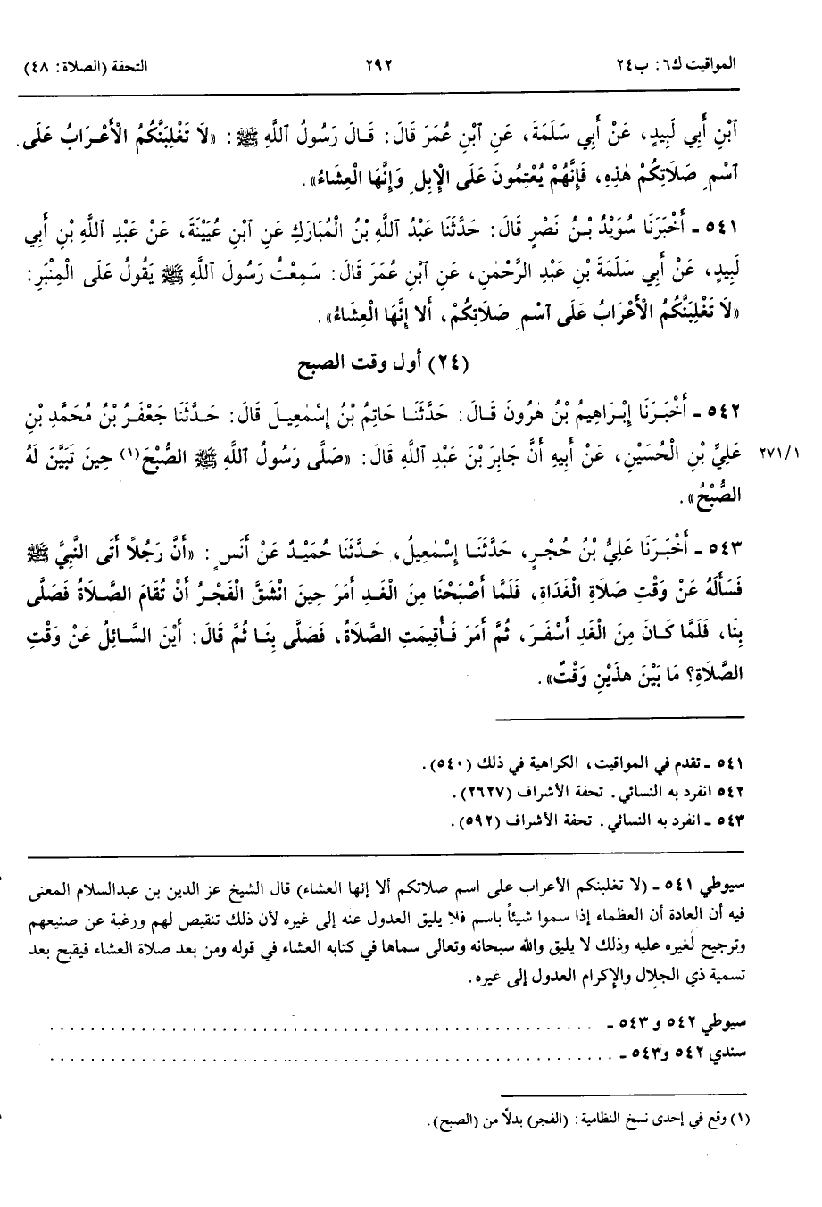 أَوَّلُ وَقْتِ الصُّبْحِ 542 - أَخْبَرَنَا إِبْرَاهِيمُ بْنُ هَارُونَ قَالَ حَدَّثَنَا حَاتِمُ بْنُ إِسْمَعِيلَ قَالَ حَدَّثَنَا جَعْفَرُ بْنُ مُحَمَّدِ بْنِ عَلِيِّ بْنِ الْحُسَيْنِ عَنْ أَبِيهِ أَنَّ جَابِرَ بْنَ عَبْدِ اللَّهِ قَالَ صَلَّى رَسُولُ اللَّهِ صَلَّى اللَّهُ عَلَيْهِ وَسَلَّمَ الصُّبْحَ حِينَ تَبَيَّنَ لَهُ الصُّبْحُ