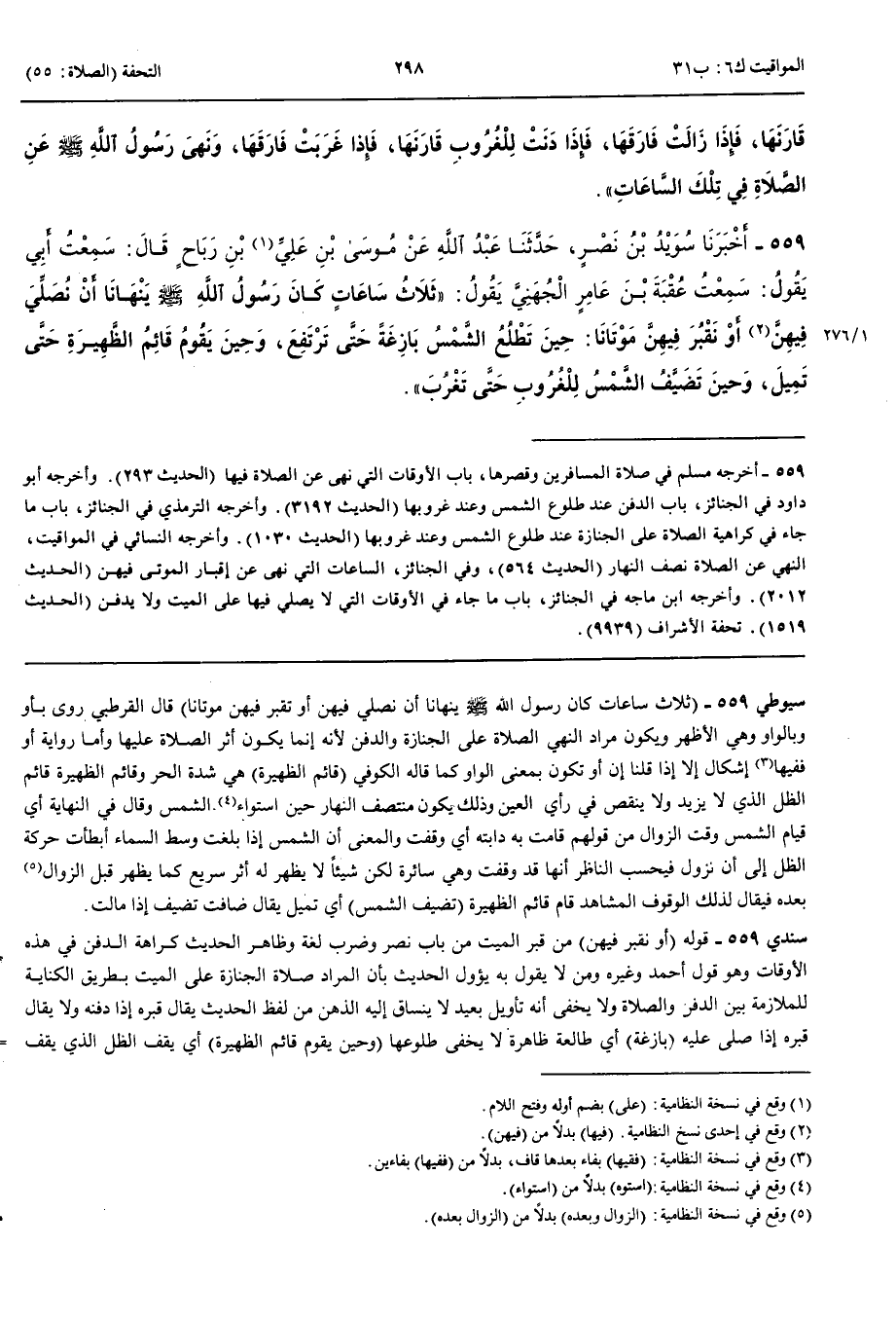 559 - أَخْبَرَنَا سُوَيْدُ بْنُ نَصْرٍ قَالَ حَدَّثَنَا عَبْدُ اللَّهِ عَنْ مُوسَى بْنِ عَلِيِّ بْنِ رَبَاحٍ قَالَ سَمِعْتُ أَبِي يَقُولُ سَمِعْتُ عُقْبَةَ بْنَ عَامِرٍ الْجُهَنِيَّ يَقُولُ ثَلَاثُ سَاعَاتٍ كَانَ رَسُولُ اللَّهِ صَلَّى اللَّهُ عَلَيْهِ وَسَلَّمَ يَنْهَانَا أَنْ نُصَلِّيَ فِيهِنَّ أَوْ نَقْبُرَ فِيهِنَّ مَوْتَانَا حِينَ تَطْلُعُ الشَّمْسُ بَازِغَةً حَتَّى تَرْتَفِعَ وَحِينَ يَقُومُ قَائِمُ الظَّهِيرَةِ حَتَّى تَمِيلَ وَحِينَ تَضَيَّفُ الشَّمْسُ لِلْغُرُوبِ حَتَّى تَغْرُبَ