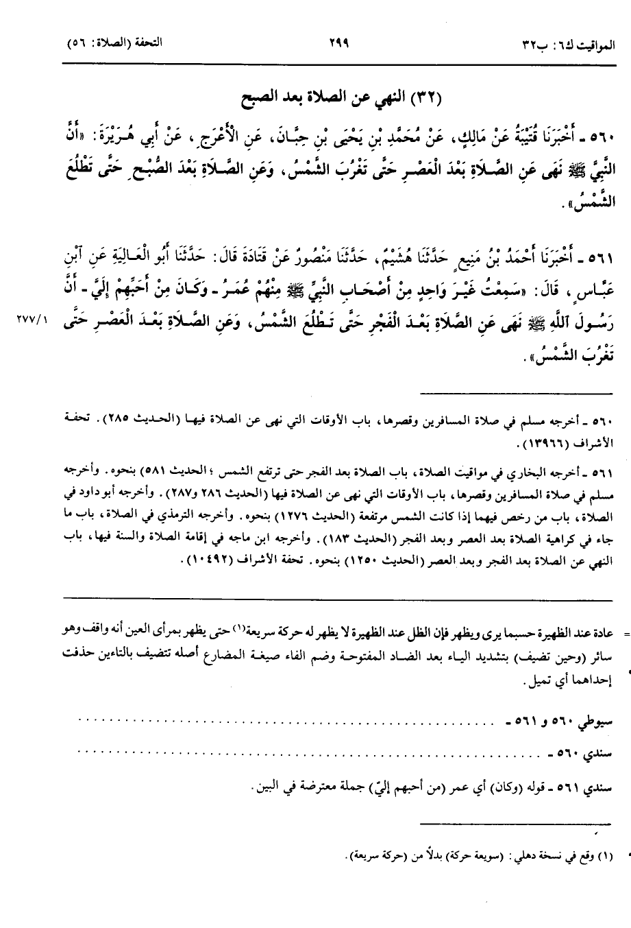 النَّهْيُ عَنْ الصَّلَاةِ بَعْدَ الصُّبْحِ 560 - أَخْبَرَنَا قُتَيْبَةُ عَنْ مَالِكٍ عَنْ مُحَمَّدِ بْنِ يَحْيَى بْنِ حَبَّانَ عَنْ الْأَعْرَجِ عَنْ أَبِي هُرَيْرَةَ أَنَّ النَّبِيَّ صَلَّى اللَّهُ عَلَيْهِ وَسَلَّمَ نَهَى عَنْ الصَّلَاةِ بَعْدَ الْعَصْرِ حَتَّى تَغْرُبَ الشَّمْسُ وَعَنْ الصَّلَاةِ بَعْدَ الصُّبْحِ حَتَّى تَطْلُعَ الشَّمْسُ