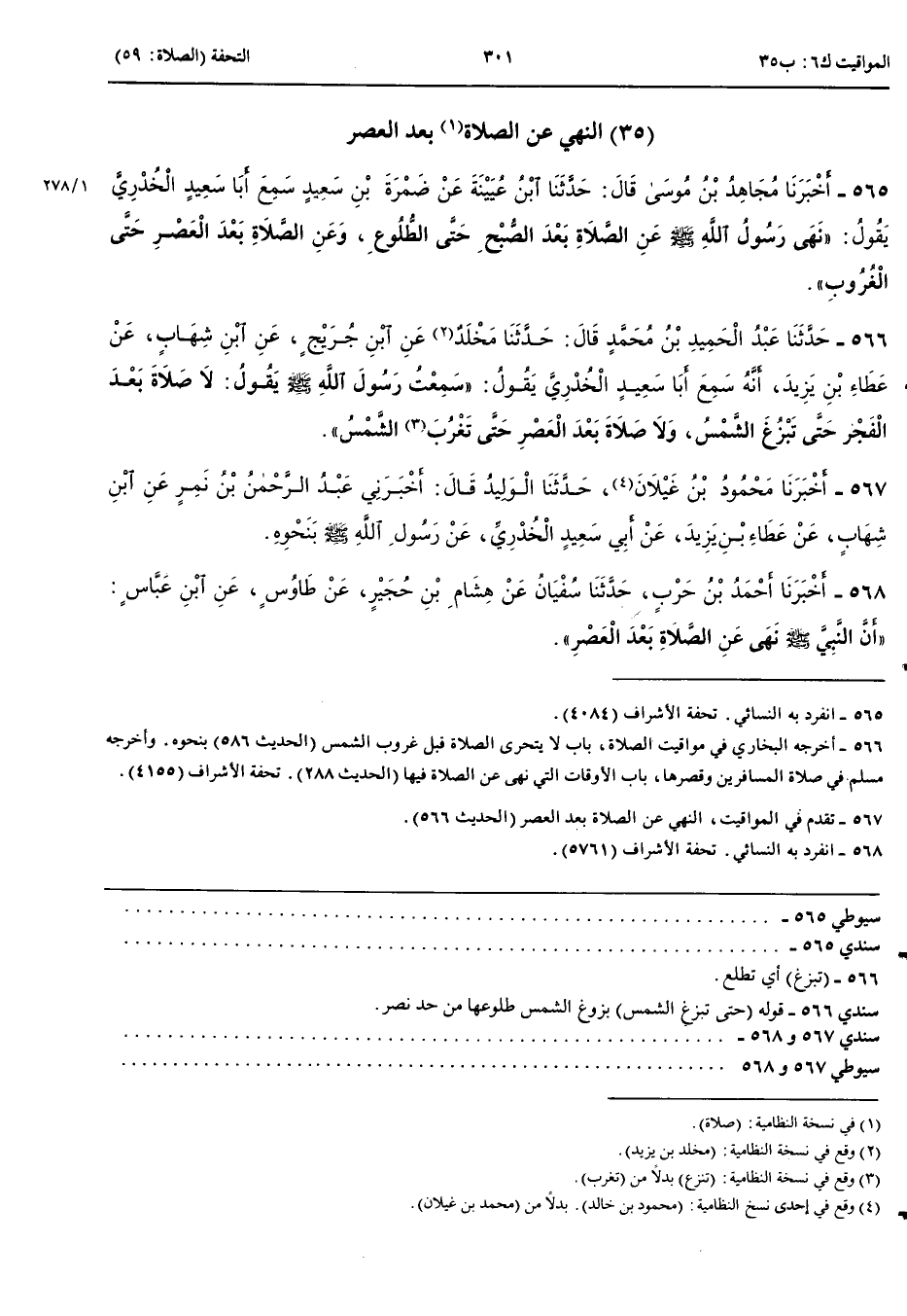 566 - أَخْبَرَنَا عَبْدُ الْحَمِيدِ بْنُ مُحَمَّدٍ قَالَ حَدَّثَنَا مَخْلَدٌ عَنْ ابْنِ جُرَيْجٍ عَنْ ابْنِ شِهَابٍ عَنْ عَطَاءِ بْنِ يَزِيدَ أَنَّهُ سَمِعَ أَبَا سَعِيدٍ الْخُدْرِيَّ يَقُولُ سَمِعْتُ رَسُولَ اللَّهِ صَلَّى اللَّهُ عَلَيْهِ وَسَلَّمَ يَقُولُ لَا صَلَاةَ بَعْدَ الْفَجْرِ حَتَّى تَبْزُغَ الشَّمْسُ وَلَا صَلَاةَ بَعْدَ الْعَصْرِ حَتَّى تَغْرُبَ الشَّمْسُ 567 - أَخْبَرَنِي مَحْمُودُ بْنُ غَيْلَانَ حَدَّثَنَا الْوَلِيدُ قَالَ أَخْبَرَنِي عَبْدُ الرَّحْمَنِ بْنُ نَمِرٍ عَنْ ابْنِ شِهَابٍ عَنْ عَطَاءِ بْنِ يَزِيدَ عَنْ أَبِي سَعِيدٍ الْخُدْرِيِّ عَنْ رَسُولِ اللَّهِ صَلَّى اللَّهُ عَلَيْهِ وَسَلَّمَ بِنَحْوِهِ