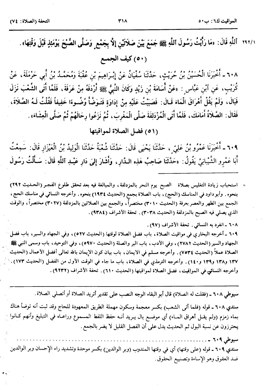 كَيْفَ الْجَمْعُ 608 - أَخْبَرَنَا الْحُسَيْنُ بْنُ حُرَيْثٍ قَالَ حَدَّثَنَا سُفْيَانُ عَنْ إِبْرَاهِيمَ بْنِ عُقْبَةَ وَمُحَمَّدُ بْنُ أَبِي حَرْمَلَةَ عَنْ كُرَيْبٍ عَنْ ابْنِ عَبَّاسٍ عَنْ أُسَامَةَ بْنِ زَيْدٍ وَكَانَ النَّبِيُّ صَلَّى اللَّهُ عَلَيْهِ وَسَلَّمَ أَرْدَفَهُ مِنْ عَرَفَةَ فَلَمَّا أَتَى الشِّعْبَ نَزَلَ فَبَالَ وَلَمْ يَقُلْ أَهْرَاقَ الْمَاءَ قَالَ فَصَبَبْتُ عَلَيْهِ مِنْ إِدَاوَةٍ فَتَوَضَّأَ وُضُوءًا خَفِيفًا فَقُلْتُ لَهُ الصَّلَاةَ فَقَالَ الصَّلَاةُ أَمَامَكَ فَلَمَّا أَتَى الْمُزْدَلِفَةَ صَلَّى الْمَغْرِبَ ثُمَّ نَزَعُوا رِحَالَهُمْ ثُمَّ صَلَّى الْعِشَاءَ