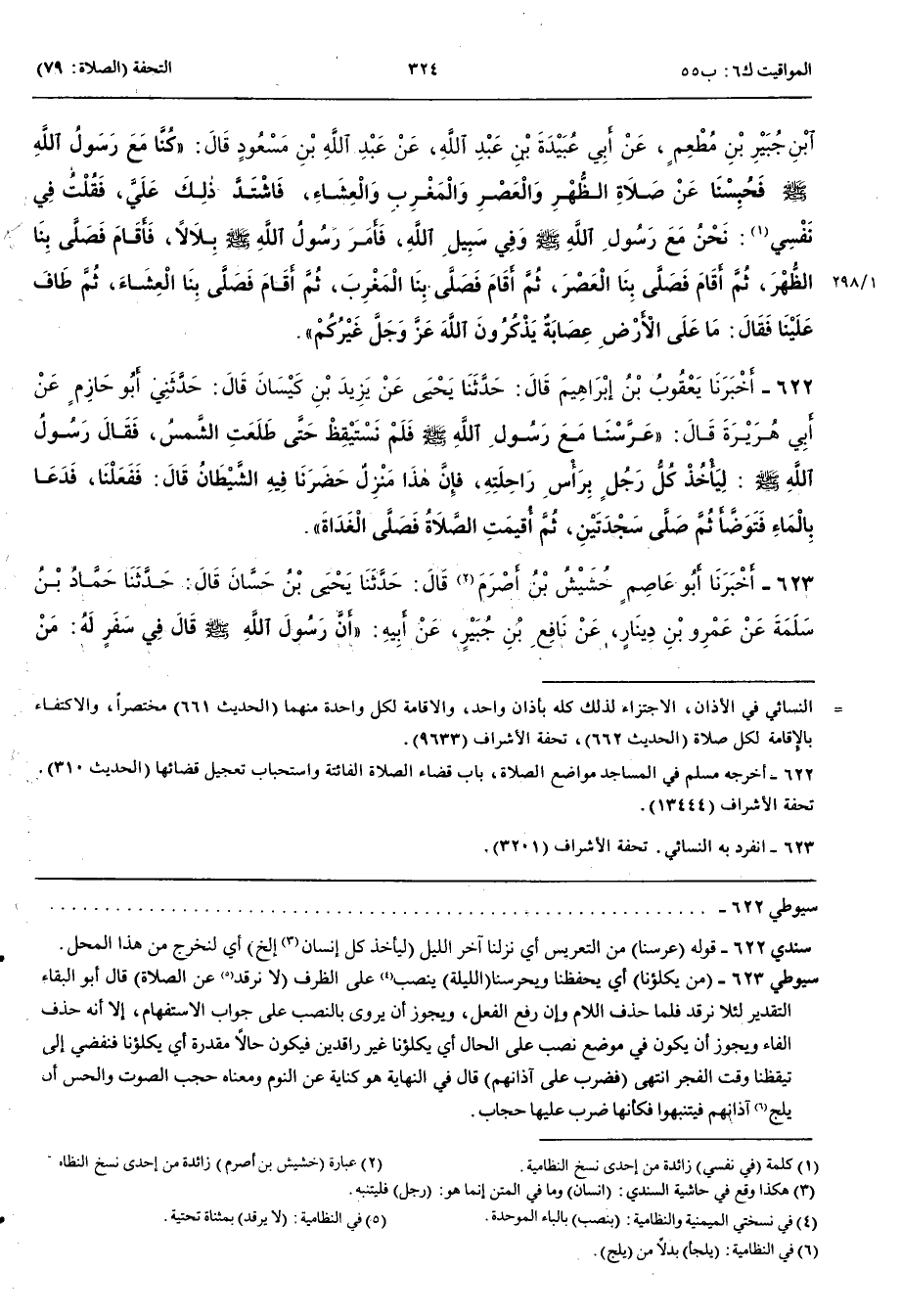 623 - أَخْبَرَنَا أَبُو عَاصِمٍ خُشَيْشُ بْنُ أَصْرَمَ قَالَ حَدَّثَنَا يَحْيَى بْنُ حَسَّانَ قَالَ حَدَّثَنَا حَمَّادُ بْنُ سَلَمَةَ عَنْ عَمْرِو بْنِ دِينَارٍ عَنْ نَافِعِ بْنِ جُبَيْرٍ عَنْ أَبِيهِ أَنَّ رَسُولَ اللَّهِ صَلَّى اللَّهُ عَلَيْهِ وَسَلَّمَ قَالَ فِي سَفَرٍ لَهُ مَنْ يَكْلَؤُنَا اللَّيْلَةَ لَا نَرْقُدَ عَنْ صَلَاةِ الصُّبْحِ قَالَ بِلَالٌ أَنَا فَاسْتَقْبَلَ مَطْلَعَ الشَّمْسِ فَضُرِبَ عَلَى آذَانِهِمْ حَتَّى أَيْقَظَهُمْ حَرُّ الشَّمْسِ فَقَامُوا فَقَالَ تَوَضَّئُوا ثُمَّ أَذَّنَ بِلَالٌ فَصَلَّى رَكْعَتَيْنِ وَصَلَّوْا رَكْعَتَيْ الْفَجْرِ ثُمَّ صَلَّوْا الْفَجْرَ