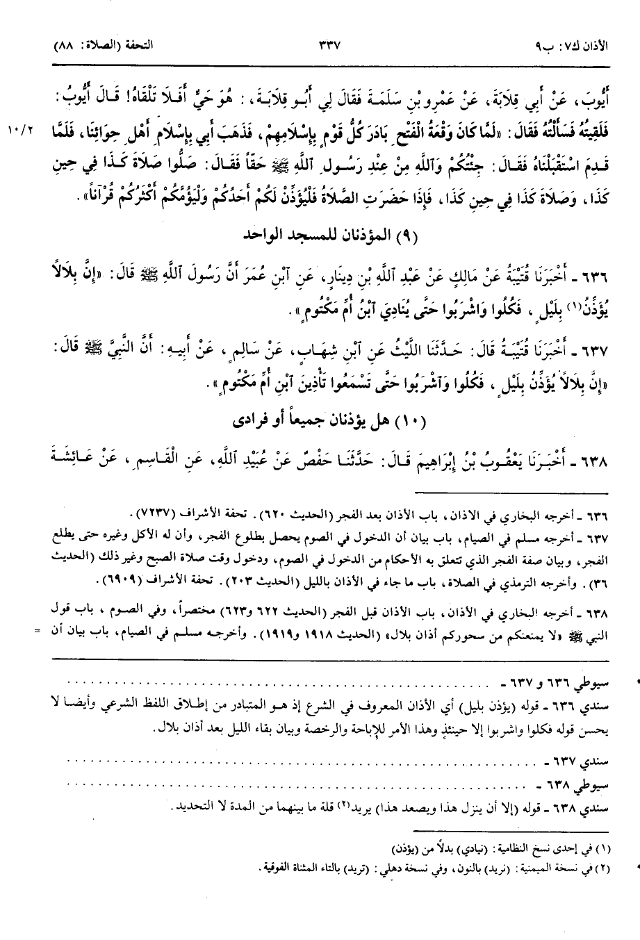 الْمُؤَذِّنَانِ لِلْمَسْجِدِ الْوَاحِدِ 636 - أَخْبَرَنَا قُتَيْبَةُ عَنْ مَالِكٍ عَنْ عَبْدِ اللَّهِ بْنِ دِينَارٍ عَنْ ابْنِ عُمَرَ أَنَّ رَسُولَ اللَّهِ صَلَّى اللَّهُ عَلَيْهِ وَسَلَّمَ قَالَ إِنَّ بِلَالًا يُؤَذِّنُ بِلَيْلٍ فَكُلُوا وَاشْرَبُوا حَتَّى يُنَادِيَ ابْنُ أُمِّ مَكْتُومٍ