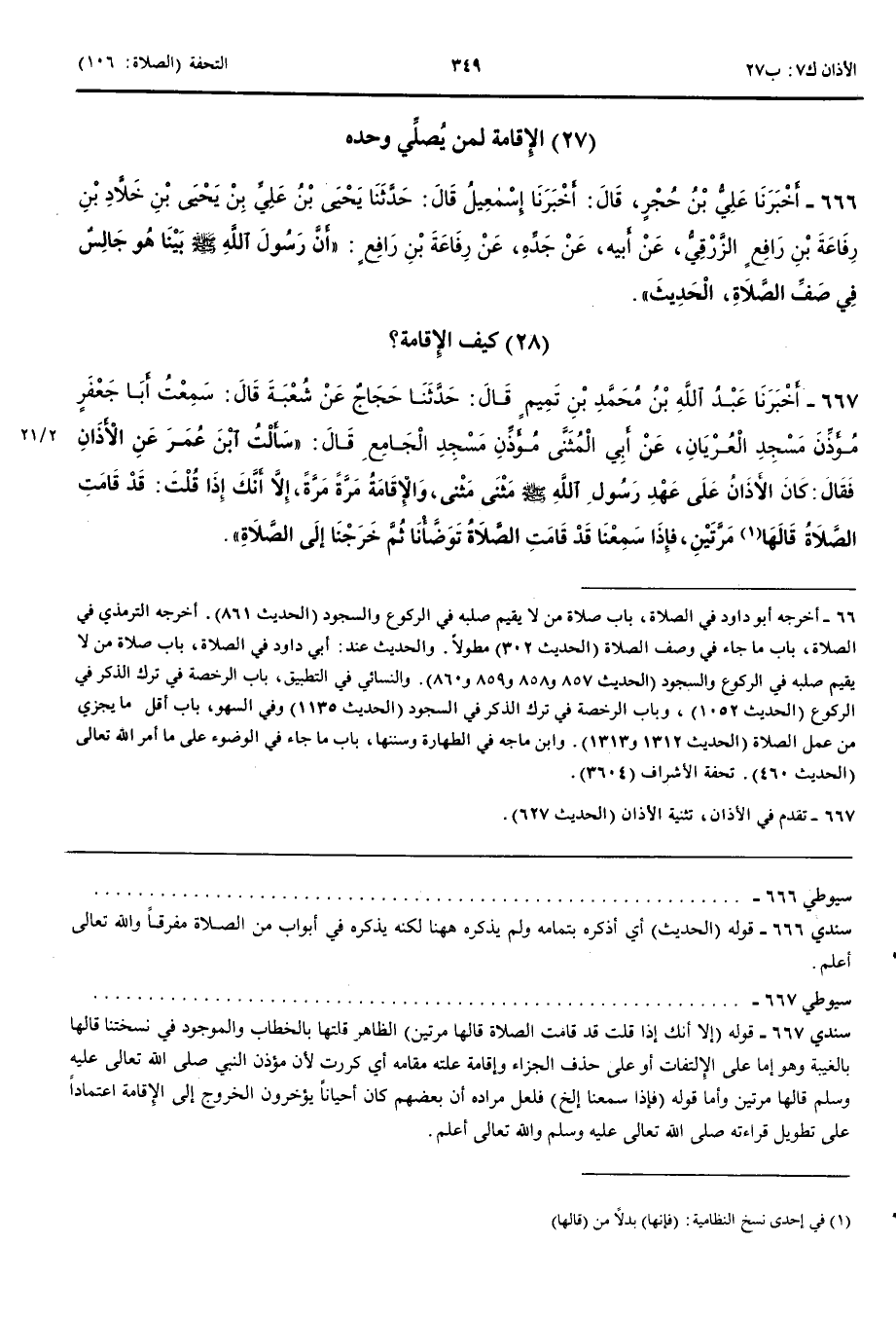 الْإِقَامَةُ لِمَنْ يُصَلِّي وَحْدَهُ 666 - أَخْبَرَنَا عَلِيُّ بْنُ حُجْرٍ قَالَ أَنْبَأَنَا إِسْمَعِيلُ قَالَ حَدَّثَنَا يَحْيَى بْنُ عَلِيِّ بْنِ يَحْيَى بْنِ خَلَّادِ بْنِ رِفَاعَةَ بْنِ رَافِعٍ الزُّرَقِيُّ عَنْ أَبِيهِ عَنْ جَدِّهِ عَنْ رِفَاعَةَ بْنِ رَافِعٍ أَنَّ رَسُولَ اللَّهِ صَلَّى اللَّهُ عَلَيْهِ وَسَلَّمَ بَيْنَا هُوَ جَالِسٌ فِي صَفِّ الصَّلَاةِ الْحَدِيثَ
