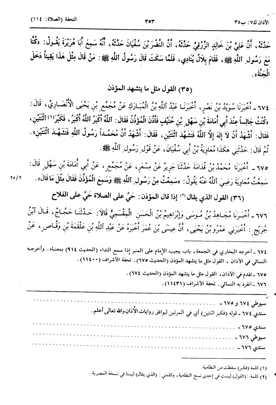 الْقَوْلُ مِثْلَ مَا يَتَشَهَّدُ الْمُؤَذِّنُ 674 - أَخْبَرَنَا سُوَيْدُ بْنُ نَصْرٍ أَنْبَأَنَا عَبْدُ اللَّهِ بْنُ الْمُبَارَكِ عَنْ مُجَمِّعِ بْنِ يَحْيَى الْأَنْصَارِيِّ قَالَ كُنْتُ جَالِسًا عِنْدَ أَبِي أُمَامَةَ بْنِ سَهْلِ بْنِ حُنَيْفٍ فَأَذَّنَ الْمُؤَذِّنُ فَقَالَ اللَّهُ أَكْبَرُ اللَّهُ أَكْبَرُ فَكَبَّرَ اثْنَتَيْنِ فَقَالَ أَشْهَدُ أَنْ لَا إِلَهَ إِلَّا اللَّهُ فَتَشَهَّدَ اثْنَتَيْنِ فَقَالَ أَشْهَدُ أَنَّ مُحَمَّدًا رَسُولُ اللَّهِ فَتَشَهَّدَ اثْنَتَيْنِ ثُمَّ قَالَ حَدَّثَنِي هَكَذَا مُعَاوِيَةُ بْنُ أَبِي سُفْيَانَ عَنْ قَوْلِ رَسُولِ اللَّهِ صَلَّى اللَّهُ عَلَيْهِ وَسَلَّمَ أَخْبَرَنَا مُحَمَّدُ بْنُ قُدَامَةَ حَدَّثَنَا جَرِيرٌ عَنْ مِسْعَرٍ عَنْ مُجَمِّعٍ عَنْ أَبِي أُمَامَةَ بْنِ سَهْلٍ قَالَ سَمِعْتُ مُعَاوِيَةَ رَضِيَ اللَّهُ عَنْهُ يَقُولُ سَمِعْتُ مِنْ رَسُولِ اللَّهِ صَلَّى اللَّهُ عَلَيْهِ وَسَلَّمَ وَسَمِعَ الْمُؤَذِّنَ فَقَالَ مِثْلَ مَا قَالَ