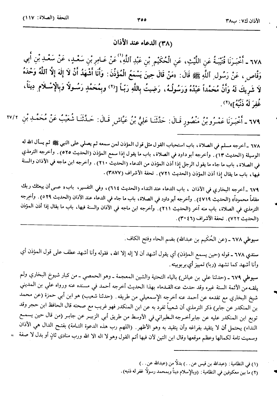 الدُّعَاءُ عِنْدَ الْأَذَانِ 678 - أَخْبَرَنَا قُتَيْبَةُ عَنْ اللَّيْثِ عَنْ الْحُكَيْمِ بْنِ عَبْدِ اللَّهِ عَنْ عَامِرِ بْنِ سَعْدٍ عَنْ سَعْدِ بْنِ أَبِي وَقَّاصٍ عَنْ رَسُولِ اللَّهِ صَلَّى اللَّهُ عَلَيْهِ وَسَلَّمَ قَالَ مَنْ قَالَ حِينَ يَسْمَعُ الْمُؤَذِّنَ وَأَنَا أَشْهَدُ أَنْ لَا إِلَهَ إِلَّا اللَّهُ وَحْدَهُ لَا شَرِيكَ لَهُ وَأَنَّ مُحَمَّدًا عَبْدُهُ وَرَسُولُهُ رَضِيتُ بِاللَّهِ رَبًّا وَبِمُحَمَّدٍ رَسُولًا وَبِالْإِسْلَامِ دِينًا غُفِرَ لَهُ ذَنْبُهُ