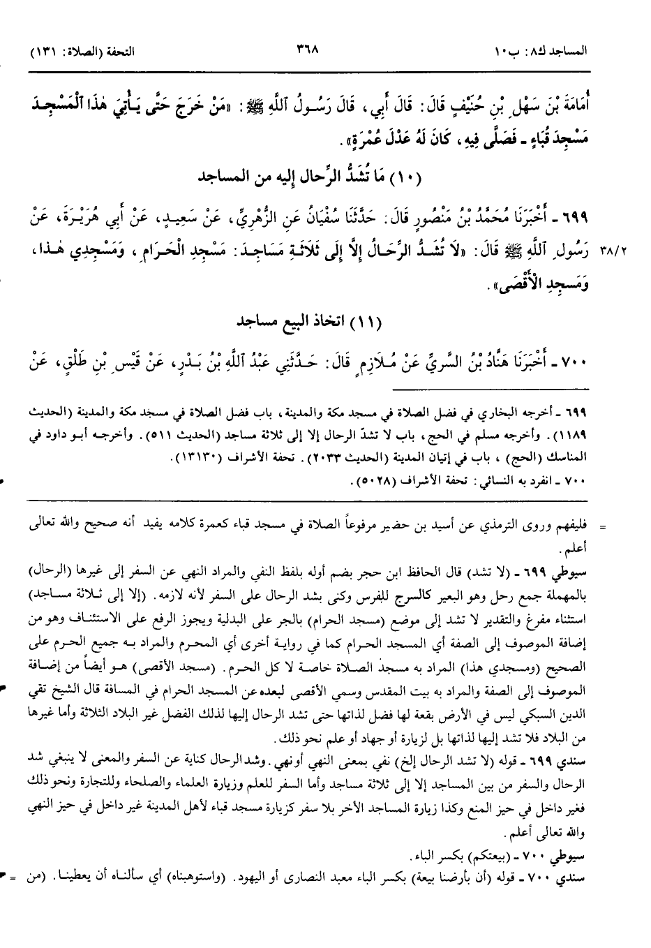 مَا تُشَدُّ الرِّحَالُ إِلَيْهِ مِنْ الْمَسَاجِدِ 699 - أَخْبَرَنَا مُحَمَّدُ بْنُ مَنْصُورٍ قَالَ حَدَّثَنَا سُفْيَانُ عَنْ الزُّهْرِيِّ عَنْ سَعِيدٍ عَنْ أَبِي هُرَيْرَةَ عَنْ رَسُولِ اللَّهِ صَلَّى اللَّهُ عَلَيْهِ وَسَلَّمَ قَالَ لَا تُشَدُّ الرِّحَالُ إِلَّا إِلَى ثَلَاثَةِ مَسَاجِدَ مَسْجِدِ الْحَرَامِ وَمَسْجِدِي هَذَا وَمَسْجِدِ الْأَقْصَى
