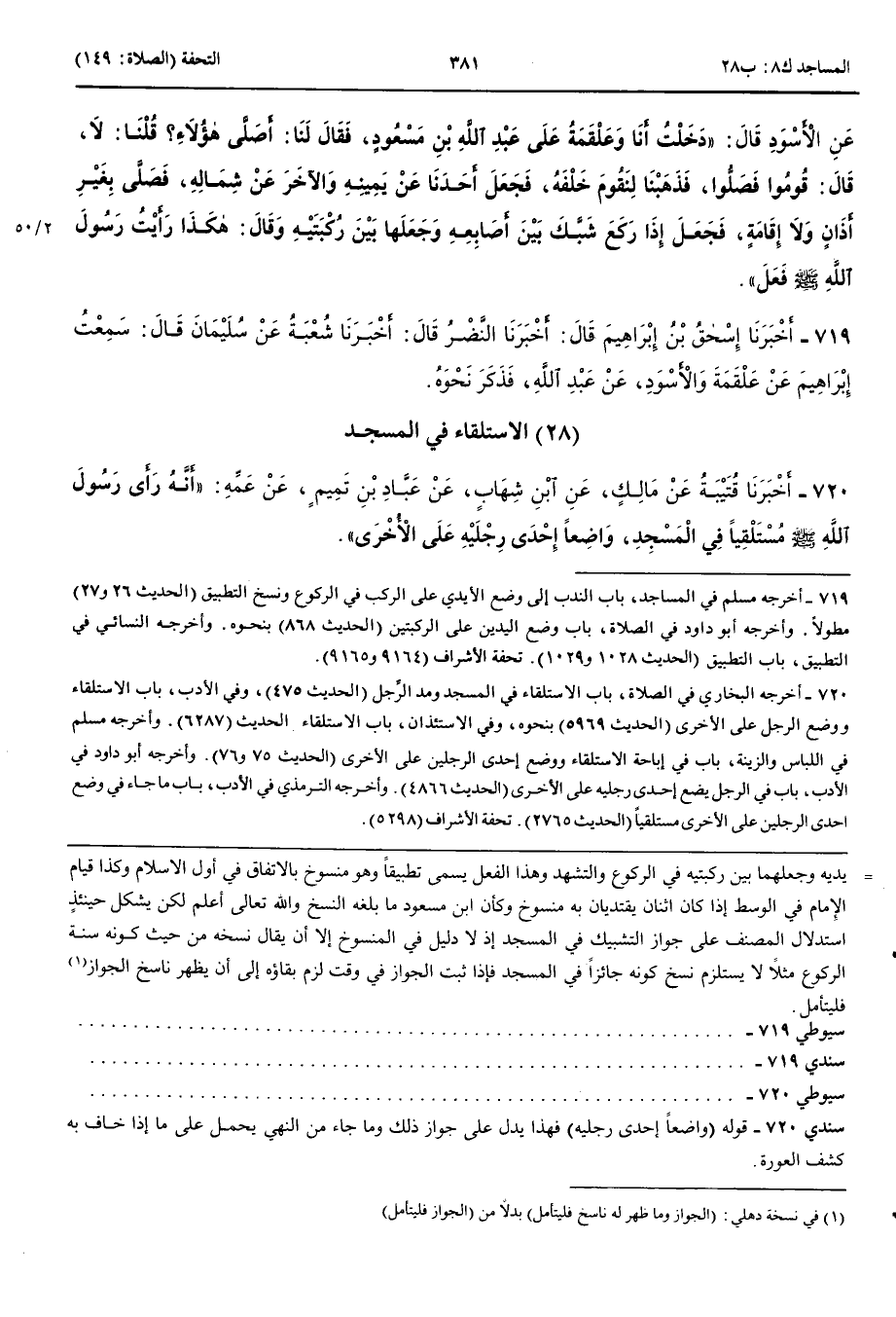 الِاسْتِلْقَاءُ فِي الْمَسْجِدِ 720 - أَخْبَرَنَا قُتَيْبَةُ عَنْ مَالِكٍ عَنْ ابْنِ شِهَابٍ عَنْ عَبَّادِ بْنِ تَمِيمٍ عَنْ عَمِّهِ أَنَّهُ رَأَى رَسُولَ اللَّهِ صَلَّى اللَّهُ عَلَيْهِ وَسَلَّمَ مُسْتَلْقِيًا فِي الْمَسْجِدِ وَاضِعًا إِحْدَى رِجْلَيْهِ عَلَى الْأُخْرَى