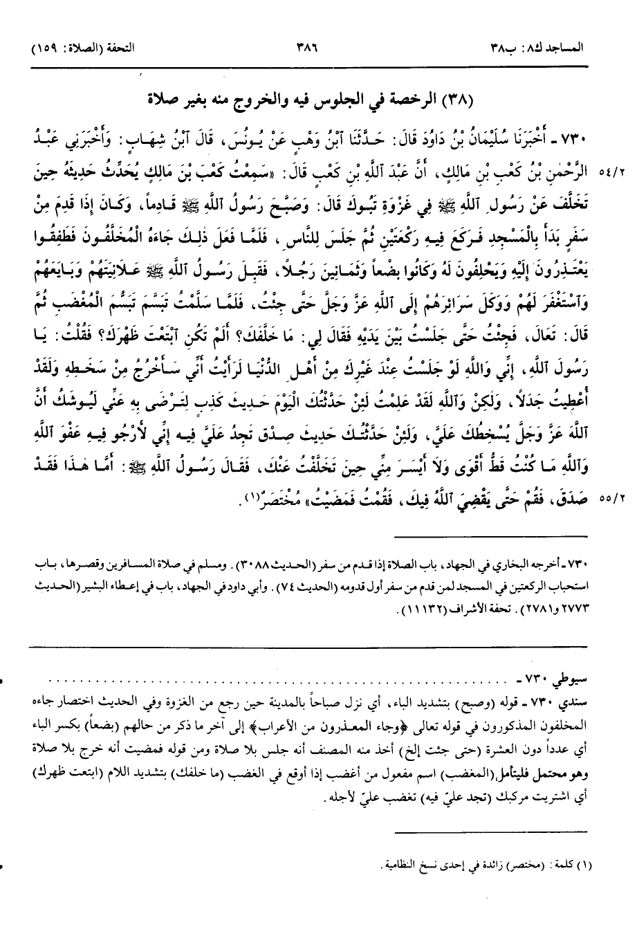 الرُّخْصَةُ فِي الْجُلُوسِ فِيهِ وَالْخُرُوجِ مِنْهُ بِغَيْرِ صَلَاةٍ 730 - أَخْبَرَنَا سُلَيْمَانُ بْنُ دَاوُدَ قَالَ حَدَّثَنَا ابْنُ وَهْبٍ عَنْ يُونُسَ قَالَ ابْنُ شِهَابٍ وَأَخْبَرَنِي عَبْدُ الرَّحْمَنِ بْنُ كَعْبِ بْنِ مَالِكٍ أَنَّ عَبْدَ اللَّهِ بْنَ كَعْبٍ قَالَ سَمِعْتُ كَعْبَ بْنَ مَالِكٍ يُحَدِّثُ حَدِيثَهُ حِينَ تَخَلَّفَ عَنْ رَسُولِ اللَّهِ صَلَّى اللَّهُ عَلَيْهِ وَسَلَّمَ فِي غَزْوَةِ تَبُوكَ قَالَ وَصَبَّحَ رَسُولُ اللَّهِ صَلَّى اللَّهُ عَلَيْهِ وَسَلَّمَ قَادِمًا وَكَانَ إِذَا قَدِمَ مِنْ سَفَرٍ بَدَأَ بِالْمَسْجِدِ فَرَكَعَ فِيهِ رَكْعَتَيْنِ ثُمَّ جَلَسَ لِلنَّاسِ فَلَمَّا فَعَلَ ذَلِكَ جَاءَهُ الْمُخَلَّفُونَ فَطَفِقُوا يَعْتَذِرُونَ إِلَيْهِ وَيَحْلِفُونَ لَهُ وَكَانُوا بِضْعًا وَثَمَانِينَ رَجُلًا فَقَبِلَ رَسُولُ اللَّهِ صَلَّى اللَّهُ عَلَيْهِ وَسَلَّمَ عَلَانِيَتَهُمْ وَبَايَعَهُمْ وَاسْتَغْفَرَ لَهُمْ وَوَكَلَ سَرَائِرَهُمْ إِلَى اللَّهِ عَزَّ وَجَلَّ حَتَّى جِئْتُ فَلَمَّا سَلَّمْتُ تَبَسَّمَ تَبَسُّمَ الْمُغْضَبِ ثُمَّ قَالَ تَعَالَ فَجِئْتُ حَتَّى جَلَسْتُ بَيْنَ يَدَيْهِ فَقَالَ لِي مَا خَلَّفَكَ أَلَمْ تَكُنِ ابْتَعْتَ ظَهْرَكَ فَقُلْتُ يَا رَسُولَ اللَّهِ إِنِّي وَاللَّهِ لَوْ جَلَسْتُ عِنْدَ غَيْرِكَ مِنْ أَهْلِ الدُّنْيَا لَرَأَيْتُ أَنِّي سَأَخْرُجُ مِنْ سَخَطِهِ وَلَقَدْ أُعْطِيتُ جَدَلًا وَلَكِنْ وَاللَّهِ لَقَدْ عَلِمْتُ لَئِنْ حَدَّثْتُكَ الْيَوْمَ حَدِيثَ كَذِبٍ لِتَرْضَى بِهِ عَنِّي لَيُوشَكُ أَنَّ اللَّهَ عَزَّ وَجَلَّ يُسْخِطُكَ عَلَيَّ وَلَئِنْ حَدَّثْتُكَ حَدِيثَ صِدْقٍ تَجِدُ عَلَيَّ فِيهِ إِنِّي لَأَرْجُو فِيهِ عَفْوَ اللَّهِ وَاللَّهِ مَا كُنْتُ قَطُّ أَقْوَى وَلَا أَيْسَرَ مِنِّي حِينَ تَخَلَّفْتُ عَنْكَ فَقَالَ رَسُولُ اللَّهِ صَلَّى اللَّهُ عَلَيْهِ وَسَلَّمَ أَمَّا هَذَا فَقَدْ صَدَقَ فَقُمْ حَتَّى يَقْضِيَ اللَّهُ فِيكَ فَقُمْتُ فَمَضَيْتُ مُخْتَصَرٌ