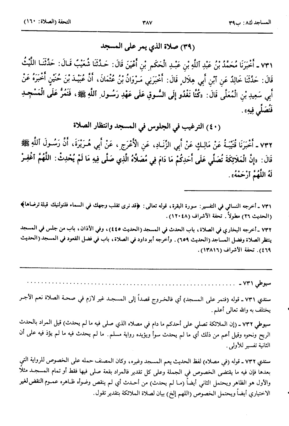 التَّرْغِيبُ فِي الْجُلُوسِ فِي الْمَسْجِدِ وَانْتِظَارِ الصَّلَاةِ 732 - أَخْبَرَنَا قُتَيْبَةُ عَنْ مَالِكٍ عَنْ أَبِي الزِّنَادِ عَنْ الْأَعْرَجِ عَنْ أَبِي هُرَيْرَةَ أَنَّ رَسُولَ اللَّهِ صَلَّى اللَّهُ عَلَيْهِ وَسَلَّمَ قَالَ إِنَّ الْمَلَائِكَةَ تُصَلِّي عَلَى أَحَدِكُمْ مَا دَامَ فِي مُصَلَّاهُ الَّذِي صَلَّى فِيهِ مَا لَمْ يُحْدِثْ اللَّهُمَّ اغْفِرْ لَهُ اللَّهُمَّ ارْحَمْهُ
