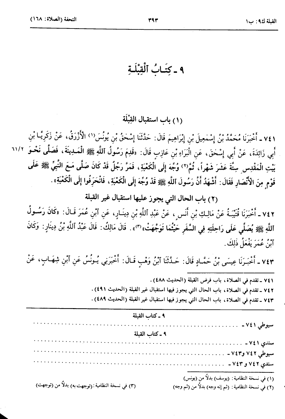 741 - أَخْبَرَنَا مُحَمَّدُ بْنُ إِسْمَعِيلَ بْنِ إِبْرَاهِيمَ قَالَ حَدَّثَنَا إِسْحَقُ بْنُ يُوسُفَ الْأَزْرَقُ عَنْ زَكَرِيَّا بْنِ أَبِي زَائِدَةَ عَنْ أَبِي إِسْحَقَ عَنْ الْبَرَاءِ بْنِ عَازِبٍ قَالَ قَدِمَ رَسُولُ اللَّهِ صَلَّى اللَّهُ عَلَيْهِ وَسَلَّمَ الْمَدِينَةَ فَصَلَّى نَحْوَ بَيْتِ الْمَقْدِسِ سِتَّةَ عَشَرَ شَهْرًا ثُمَّ وُجِّهَ إِلَى الْكَعْبَةِ فَمَرَّ رَجُلٌ قَدْ كَانَ صَلَّى مَعَ النَّبِيِّ صَلَّى اللَّهُ عَلَيْهِ وَسَلَّمَ عَلَى قَوْمٍ مِنْ الْأَنْصَارِ فَقَالَ أَشْهَدُ أَنَّ رَسُولَ اللَّهِ صَلَّى اللَّهُ عَلَيْهِ وَسَلَّمَ قَدْ وُجِّهَ إِلَى الْكَعْبَةِ فَانْحَرَفُوا إِلَى الْكَعْبَةِ