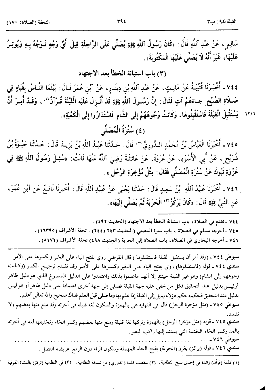 بَاب اسْتِبَانَةِ الْخَطَإِ بَعْدَ الِاجْتِهَادِ 744 - أَخْبَرَنَا قُتَيْبَةُ عَنْ مَالِكٍ عَنْ عَبْدِ اللَّهِ بْنِ دِينَارٍ عَنْ ابْنِ عُمَرَ قَالَ بَيْنَمَا النَّاسُ بِقُبَاءَ فِي صَلَاةِ الصُّبْحِ جَاءَهُمْ آتٍ فَقَالَ إِنَّ رَسُولَ اللَّهِ صَلَّى اللَّهُ عَلَيْهِ وَسَلَّمَ قَدْ أُنْزِلَ عَلَيْهِ اللَّيْلَةَ قُرْآنٌ وَقَدْ أُمِرَ أَنْ يَسْتَقْبِلَ الْقِبْلَةَ فَاسْتَقْبِلُوهَا وَكَانَتْ وُجُوهُهُمْ إِلَى الشَّامِ فَاسْتَدَارُوا إِلَى الْكَعْبَةِ