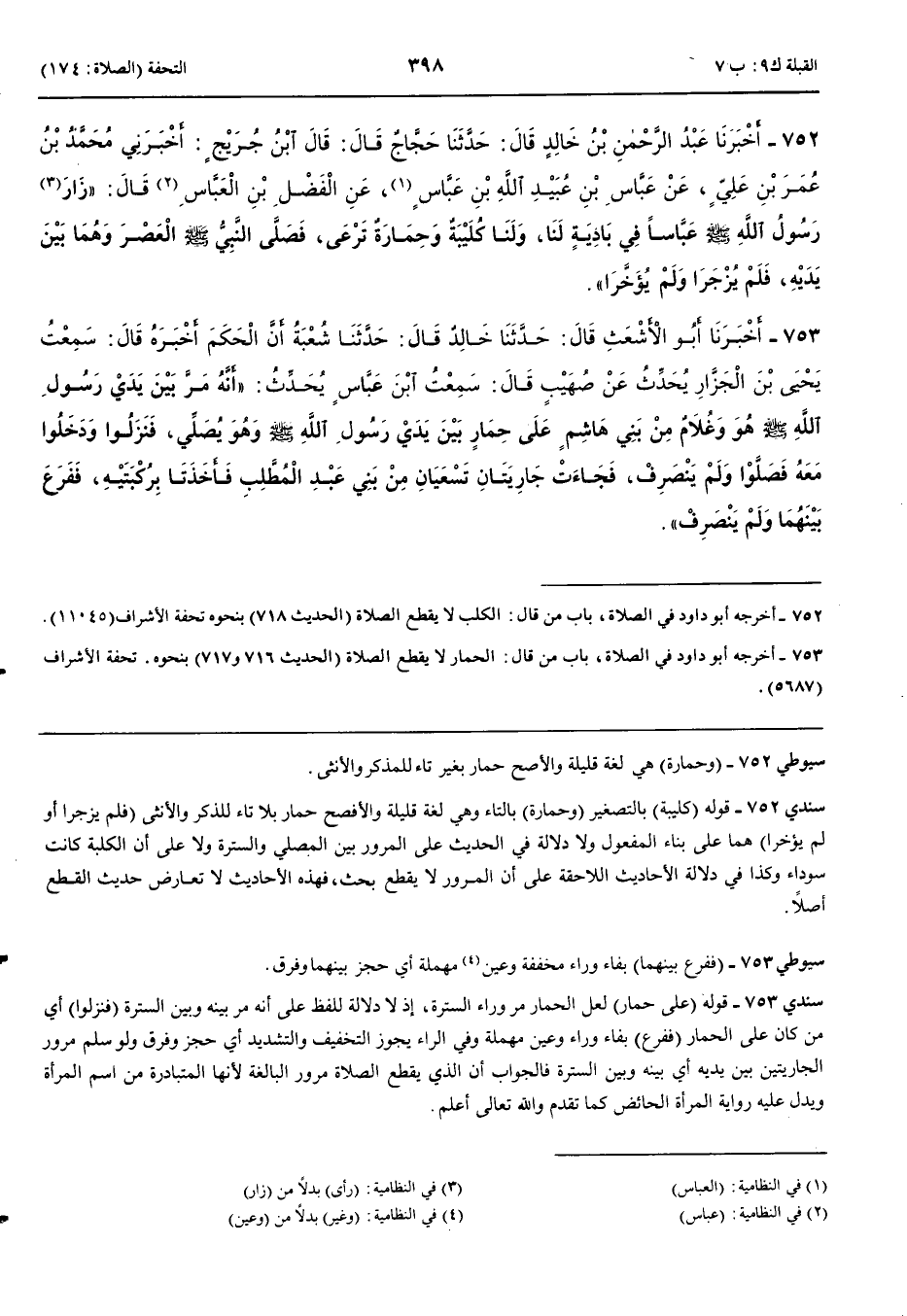 752 - أَخْبَرَنَا عَبْدُ الرَّحْمَنِ بْنُ خَالِدٍ قَالَ حَدَّثَنَا حَجَّاجٌ قَالَ قَالَ ابْنُ جُرَيْجٍ أَخْبَرَنِي مُحَمَّدُ بْنُ عُمَرَ بْنِ عَلِيٍّ عَنْ عَبَّاسِ بْنِ عُبَيْدِ اللَّهِ بْنِ عَبَّاسٍ عَنْ الْفَضْلِ بْنِ الْعَبَّاسِ قَالَ زَارَ رَسُولُ اللَّهِ صَلَّى اللَّهُ عَلَيْهِ وَسَلَّمَ عَبَّاسًا فِي بَادِيَةٍ لَنَا وَلَنَا كُلَيْبَةٌ وَحِمَارَةٌ تَرْعَى فَصَلَّى النَّبِيُّ صَلَّى اللَّهُ عَلَيْهِ وَسَلَّمَ الْعَصْرَ وَهُمَا بَيْنَ يَدَيْهِ فَلَمْ يُزْجَرَا وَلَمْ يُؤَخَّرَا