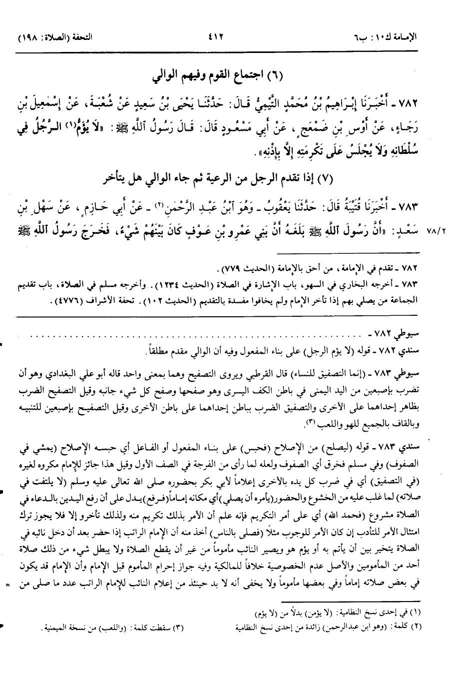 إِذَا تَقَدَّمَ الرَّجُلُ مِنْ الرَّعِيَّةِ ثُمَّ جَاءَ الْوَالِي هَلْ يَتَأَخَّرُ 783 - أَخْبَرَنَا قُتَيْبَةُ قَالَ حَدَّثَنَا يَعْقُوبُ وَهُوَ ابْنُ عَبْدِ الرَّحْمَنِ عَنْ أَبِي حَازِمٍ عَنْ سَهْلِ بْنِ سَعْدٍ أَنَّ رَسُولَ اللَّهِ صَلَّى اللَّهُ عَلَيْهِ وَسَلَّمَ بَلَغَهُ أَنَّ بَنِي عَمْرِو بْنِ عَوْفٍ كَانَ بَيْنَهُمْ شَيْءٌ فَخَرَجَ رَسُولُ اللَّهِ صَلَّى اللَّهُ عَلَيْهِ وَسَلَّمَ لِيُصْلِحَ بَيْنَهُمْ فِي أُنَاسٍ مَعَهُ فَحُبِسَ رَسُولُ اللَّهِ صَلَّى اللَّهُ عَلَيْهِ وَسَلَّمَ فَحَانَتْ الْأُولَى فَجَاءَ بِلَالٌ إِلَى أَبِي بَكْرٍ فَقَالَ يَا أَبَا بَكْرٍ إِنَّ رَسُولَ اللَّهِ صَلَّى اللَّهُ عَلَيْهِ وَسَلَّمَ قَدْ حُبِسَ وَقَدْ حَانَتْ الصَّلَاةُ فَهَلْ لَكَ أَنْ تَؤُمَّ النَّاسَ قَالَ نَعَمْ إِنْ شِئْتَ فَأَقَامَ بِلَالٌ وَتَقَدَّمَ أَبُو بَكْرٍ فَكَبَّرَ بِالنَّاسِ وَجَاءَ رَسُولُ اللَّهِ صَلَّى اللَّهُ عَلَيْهِ وَسَلَّمَ يَمْشِي فِي الصُّفُوفِ حَتَّى قَامَ فِي الصَّفِّ وَأَخَذَ النَّاسُ فِي التَّصْفِيقِ وَكَانَ أَبُو بَكْرٍ لَا يَلْتَفِتُ فِي صَلَاتِهِ فَلَمَّا أَكْثَرَ النَّاسُ الْتَفَتَ فَإِذَا رَسُولُ اللَّهِ صَلَّى اللَّهُ عَلَيْهِ وَسَلَّمَ فَأَشَارَ إِلَيْهِ رَسُولُ اللَّهِ صَلَّى اللَّهُ عَلَيْهِ وَسَلَّمَ يَأْمُرُهُ أَنْ يُصَلِّيَ فَرَفَعَ أَبُو بَكْرٍ يَدَيْهِ فَحَمِدَ اللَّهَ عَزَّ وَجَلَّ وَرَجَعَ الْقَهْقَرَى وَرَاءَهُ حَتَّى قَامَ فِي الصَّفِّ فَتَقَدَّمَ رَسُولُ اللَّهِ صَلَّى اللَّهُ عَلَيْهِ وَسَلَّمَ فَصَلَّى بِالنَّاسِ فَلَمَّا فَرَغَ أَقْبَلَ عَلَى النَّاسِ فَقَالَ يَا أَيُّهَا النَّاسُ مَا لَكُمْ حِينَ نَابَكُمْ شَيْءٌ فِي الصَّلَاةِ أَخَذْتُمْ فِي التَّصْفِيقِ إِنَّمَا التَّصْفِيقُ لِلنِّسَاءِ مَنْ نَابَهُ شَيْءٌ فِي صَلَاتِهِ فَلْيَقُلْ سُبْحَانَ اللَّهِ فَإِنَّهُ لَا يَسْمَعُهُ أَحَدٌ حِينَ يَقُولُ سُبْحَانَ اللَّهِ إِلَّا الْتَفَتَ إِلَيْهِ يَا أَبَا بَكْرٍ مَا مَنَعَكَ أَنْ تُصَلِّيَ لِلنَّاسِ حِينَ أَشَرْتُ إِلَيْكَ قَالَ أَبُو بَكْرٍ مَا كَانَ يَنْبَغِي لِابْنِ أَبِي قُحَافَةَ أَنْ يُصَلِّيَ بَيْنَ يَدَيْ رَسُولِ اللَّهِ صَلَّى اللَّهُ عَلَيْهِ وَسَلَّمَ