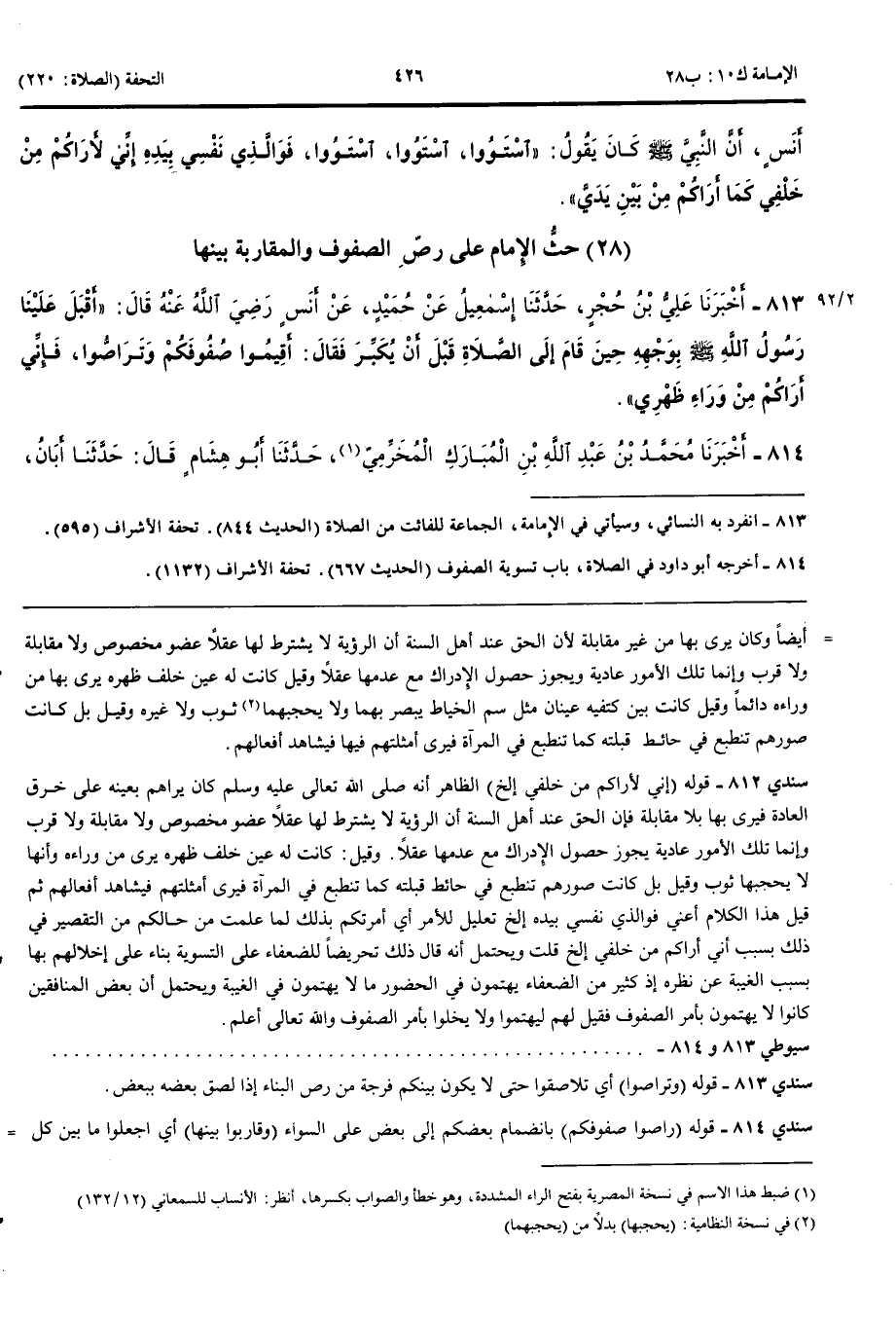حَثُّ الْإِمَامِ عَلَى رَصِّ الصُّفُوفِ وَالْمُقَارَبَةِ بَيْنَهَا 813 - أَخْبَرَنَا عَلِيُّ بْنُ حُجْرٍ أَنْبَأَنَا إِسْمَعِيلُ عَنْ حُمَيْدٍ عَنْ أَنَسٍ رَضِيَ اللَّهُ عَنْهُ قَالَ أَقْبَلَ عَلَيْنَا رَسُولُ اللَّهِ صَلَّى اللَّهُ عَلَيْهِ وَسَلَّمَ بِوَجْهِهِ حِينَ قَامَ إِلَى الصَّلَاةِ قَبْلَ أَنْ يُكَبِّرَ فَقَالَ أَقِيمُوا صُفُوفَكُمْ وَتَرَاصُّوا فَإِنِّي أَرَاكُمْ مِنْ وَرَاءِ ظَهْرِي