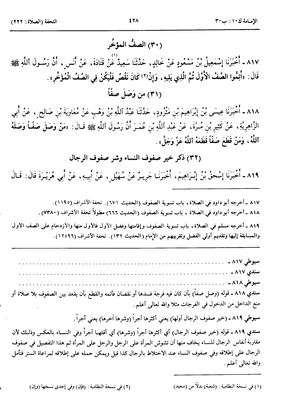 ذِكْرُ خَيْرِ صُفُوفِ النِّسَاءِ وَشَرِّ صُفُوفِ الرِّجَالِ 819 - أَخْبَرَنَا إِسْحَقُ بْنُ إِبْرَاهِيمَ قَالَ حَدَّثَنَا جَرِيرٌ عَنْ سُهَيْلٍ عَنْ أَبِيهِ عَنْ أَبِي هُرَيْرَةَ قَالَ قَالَ رَسُولُ اللَّهِ صَلَّى اللَّهُ عَلَيْهِ وَسَلَّمَ خَيْرُ صُفُوفِ الرِّجَالِ أَوَّلُهَا وَشَرُّهَا آخِرُهَا وَخَيْرُ صُفُوفِ النِّسَاءِ آخِرُهَا وَشَرُّهَا أَوَّلُهَا