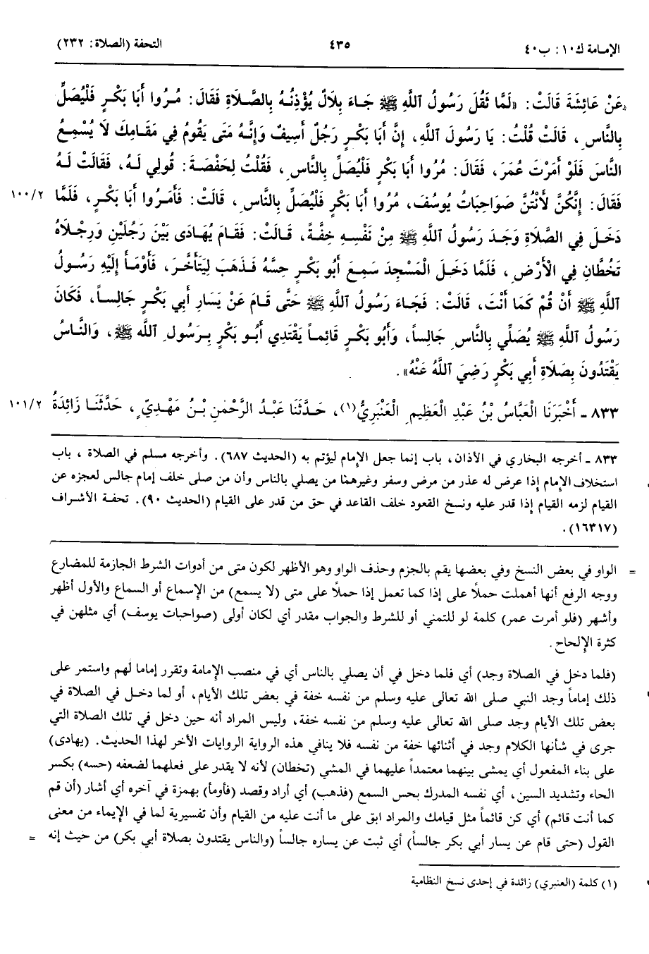 833 - أَخْبَرَنَا الْعَبَّاسُ بْنُ عَبْدِ الْعَظِيمِ الْعَنْبَرِيُّ قَالَ حَدَّثَنَا عَبْدُ الرَّحْمَنِ بْنُ مَهْدِيٍّ قَالَ حَدَّثَنَا زَائِدَةُ عَنْ مُوسَى بْنِ أَبِي عَائِشَةَ عَنْ عُبَيْدِ اللَّهِ بْنِ عَبْدِ اللَّهِ قَالَ دَخَلْتُ عَلَى عَائِشَةَ فَقُلْتُ أَلَا تُحَدِّثِينِي عَنْ مَرَضِ رَسُولِ اللَّهِ صَلَّى اللَّهُ عَلَيْهِ وَسَلَّمَ قَالَتْ لَمَّا ثَقُلَ رَسُولُ اللَّهِ صَلَّى اللَّهُ عَلَيْهِ وَسَلَّمَ فَقَالَ أَصَلَّى النَّاسُ فَقُلْنَا لَا وَهُمْ يَنْتَظِرُونَكَ يَا رَسُولَ اللَّهِ فَقَالَ ضَعُوا لِي مَاءً فِي الْمِخْضَبِ فَفَعَلْنَا فَاغْتَسَلَ ثُمَّ ذَهَبَ لِيَنُوءَ فَأُغْمِيَ عَلَيْهِ ثُمَّ أَفَاقَ فَقَالَ أَصَلَّى النَّاسُ قُلْنَا لَا هُمْ يَنْتَظِرُونَكَ يَا رَسُولَ اللَّهِ فَقَالَ ضَعُوا لِي مَاءً فِي الْمِخْضَبِ فَفَعَلْنَا فَاغْتَسَلَ ثُمَّ ذَهَبَ لِيَنُوءَ ثُمَّ أُغْمِيَ عَلَيْهِ ثُمَّ قَالَ فِي الثَّالِثَةِ مِثْلَ قَوْلِهِ قَالَتْ وَالنَّاسُ عُكُوفٌ فِي الْمَسْجِدِ يَنْتَظِرُونَ رَسُولَ اللَّهِ صَلَّى اللَّهُ عَلَيْهِ وَسَلَّمَ لِصَلَاةِ الْعِشَاءِ فَأَرْسَلَ رَسُولُ اللَّهِ صَلَّى اللَّهُ عَلَيْهِ وَسَلَّمَ إِلَى أَبِي بَكْرٍ أَنْ صَلِّ بِالنَّاسِ فَجَاءَهُ الرَّسُولُ فَقَالَ إِنَّ رَسُولَ اللَّهِ صَلَّى اللَّهُ عَلَيْهِ وَسَلَّمَ يَأْمُرُكَ أَنْ تُصَلِّيَ بِالنَّاسِ وَكَانَ أَبُو بَكْرٍ رَجُلًا رَقِيقًا فَقَالَ يَا عُمَرُ صَلِّ بِالنَّاسِ فَقَالَ أَنْتَ أَحَقُّ بِذَلِكَ فَصَلَّى بِهِمْ أَبُو بَكْرٍ تِلْكَ الْأَيَّامَ ثُمَّ إِنَّ رَسُولَ اللَّهِ صَلَّى اللَّهُ عَلَيْهِ وَسَلَّمَ وَجَدَ مِنْ نَفْسِهِ خِفَّةً فَجَاءَ يُهَادَى بَيْنَ رَجُلَيْنِ أَحَدُهُمَا الْعَبَّاسُ لِصَلَاةِ الظُّهْرِ فَلَمَّا رَآهُ أَبُو بَكْرٍ ذَهَبَ لِيَتَأَخَّرَ فَأَوْمَأَ إِلَيْهِ رَسُولُ اللَّهِ صَلَّى اللَّهُ عَلَيْهِ وَسَلَّمَ أَنْ لَا يَتَأَخَّرَ وَأَمَرَهُمَا فَأَجْلَسَاهُ إِلَى جَنْبِهِ فَجَعَلَ أَبُو بَكْرٍ يُصَلِّي قَائِمًا وَالنَّاسُ يُصَلُّونَ بِصَلَاةِ أَبِي بَكْرٍ وَرَسُولُ اللَّهِ صَلَّى اللَّهُ عَلَيْهِ وَسَلَّمَ يُصَلِّي قَاعِدًا فَدَخَلْتُ عَلَى ابْنِ عَبَّاسٍ فَقُلْتُ أَلَا أَعْرِضُ عَلَيْكَ مَا حَدَّثَتْنِي عَائِشَةُ عَنْ مَرَضِ رَسُولِ اللَّهِ صَلَّى اللَّهُ عَلَيْهِ وَسَلَّمَ قَالَ نَعَمْ فَحَدَّثْتُهُ فَمَا أَنْكَرَ مِنْهُ شَيْئًا غَيْرَ أَنَّهُ قَالَ أَسَمَّتْ لَكَ الرَّجُلَ الَّذِي كَانَ مَعَ الْعَبَّاسِ قُلْتُ لَا قَالَ هُوَ عَلِيٌّ كَرَّمَ اللَّهُ وَجْهَهُ