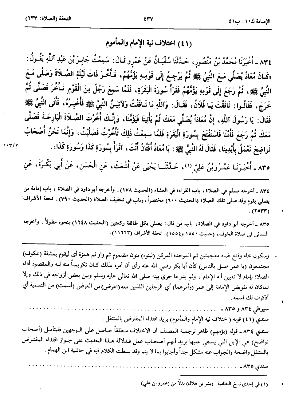 اخْتِلَافُ نِيَّةِ الْإِمَامِ وَالْمَأْمُومِ 834 - أَخْبَرَنَا مُحَمَّدُ بْنُ مَنْصُورٍ قَالَ حَدَّثَنَا سُفْيَانُ عَنْ عَمْرٍو قَالَ سَمِعْتُ جَابِرَ بْنَ عَبْدِ اللَّهِ يَقُولُ كَانَ مُعَاذٌ يُصَلِّي مَعَ النَّبِيِّ صَلَّى اللَّهُ عَلَيْهِ وَسَلَّمَ ثُمَّ يَرْجِعُ إِلَى قَوْمِهِ يَؤُمُّهُمْ فَأَخَّرَ ذَاتَ لَيْلَةٍ الصَّلَاةَ وَصَلَّى مَعَ النَّبِيِّ صَلَّى اللَّهُ عَلَيْهِ وَسَلَّمَ ثُمَّ رَجَعَ إِلَى قَوْمِهِ يَؤُمُّهُمْ فَقَرَأَ سُورَةَ الْبَقَرَةِ فَلَمَّا سَمِعَ رَجُلٌ مِنْ الْقَوْمِ تَأَخَّرَ فَصَلَّى ثُمَّ خَرَجَ فَقَالُوا نَافَقْتَ يَا فُلَانُ فَقَالَ وَاللَّهِ مَا نَافَقْتُ وَلَآتِيَنَّ النَّبِيَّ صَلَّى اللَّهُ عَلَيْهِ وَسَلَّمَ فَأُخْبِرُهُ فَأَتَى النَّبِيَّ صَلَّى اللَّهُ عَلَيْهِ وَسَلَّمَ فَقَالَ يَا رَسُولَ اللَّهِ إِنَّ مُعَاذًا يُصَلِّي مَعَكَ ثُمَّ يَأْتِينَا فَيَؤُمُّنَا وَإِنَّكَ أَخَّرْتَ الصَّلَاةَ الْبَارِحَةَ فَصَلَّى مَعَكَ ثُمَّ رَجَعَ فَأَمَّنَا فَاسْتَفْتَحَ بِسُورَةِ الْبَقَرَةِ فَلَمَّا سَمِعْتُ ذَلِكَ تَأَخَّرْتُ فَصَلَّيْتُ وَإِنَّمَا نَحْنُ أَصْحَابُ نَوَاضِحَ نَعْمَلُ بِأَيْدِينَا فَقَالَ لَهُ النَّبِيُّ صَلَّى اللَّهُ عَلَيْهِ وَسَلَّمَ يَا مُعَاذُ أَفَتَّانٌ أَنْتَ اقْرَأْ بِسُورَةِ كَذَا وَسُورَةِ كَذَا
