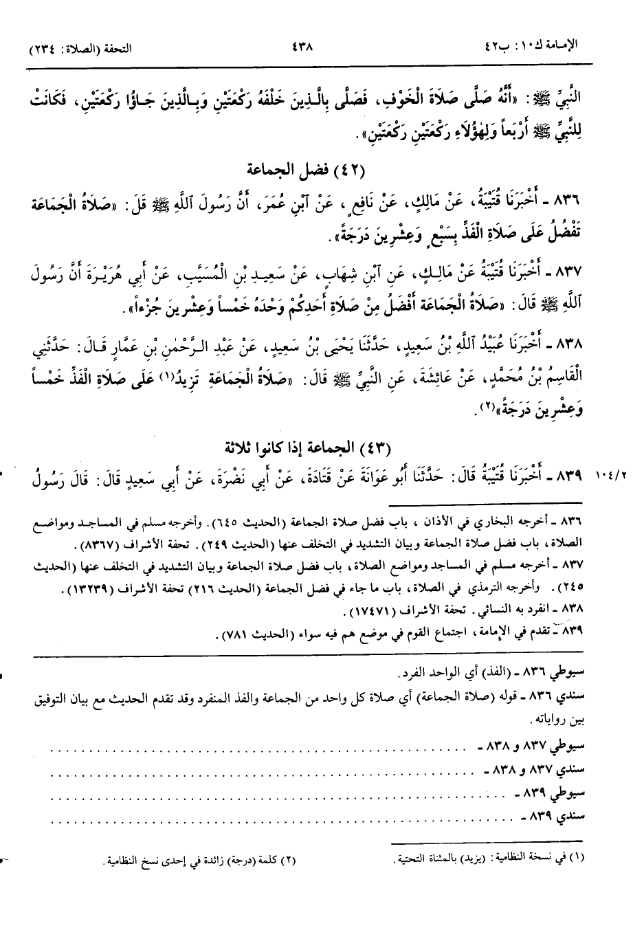 فَضْلُ الْجَمَاعَةِ 836 - أَخْبَرَنَا قُتَيْبَةُ عَنْ مَالِكٍ عَنْ نَافِعٍ عَنْ ابْنِ عُمَرَ أَنَّ رَسُولَ اللَّهِ صَلَّى اللَّهُ عَلَيْهِ وَسَلَّمَ قَالَ صَلَاةُ الْجَمَاعَةِ تَفْضُلُ عَلَى صَلَاةِ الْفَذِّ بِسَبْعٍ وَعِشْرِينَ دَرَجَةً