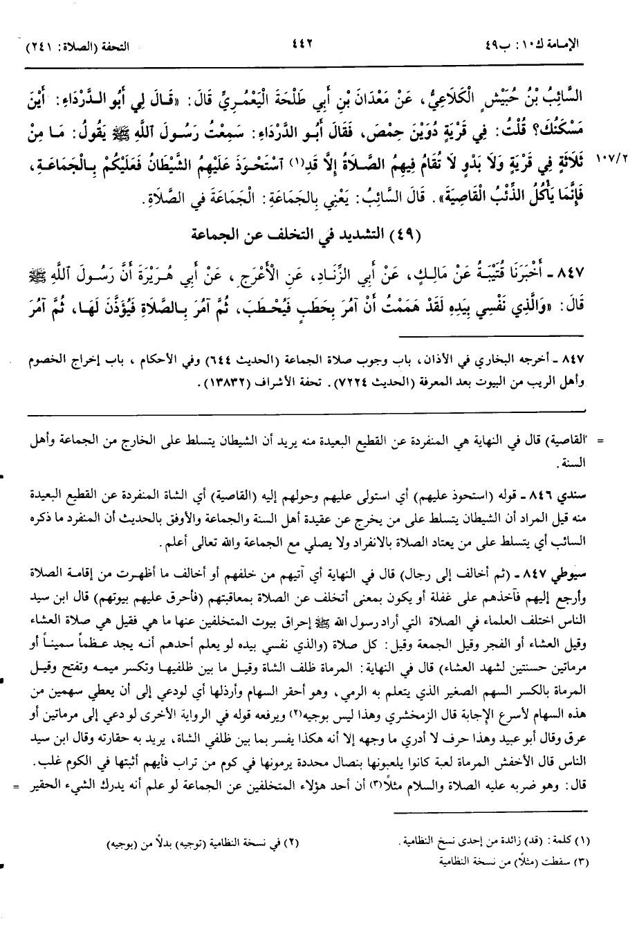 التَّشْدِيدُ فِي التَّخَلُّفِ عَنْ الْجَمَاعَةِ 847 - أَخْبَرَنَا قُتَيْبَةُ عَنْ مَالِكٍ عَنْ أَبِي الزِّنَادِ عَنْ الْأَعْرَجِ عَنْ أَبِي هُرَيْرَةَ أَنَّ رَسُولَ اللَّهِ صَلَّى اللَّهُ عَلَيْهِ وَسَلَّمَ قَالَ وَالَّذِي نَفْسِي بِيَدِهِ لَقَدْ هَمَمْتُ أَنْ آمُرَ بِحَطَبٍ فَيُحْطَبَ ثُمَّ آمُرَ بِالصَّلَاةِ فَيُؤَذَّنَ لَهَا ثُمَّ آمُرَ رَجُلًا فَيَؤُمَّ النَّاسَ ثُمَّ أُخَالِفَ إِلَى رِجَالٍ فَأُحَرِّقَ عَلَيْهِمْ بُيُوتَهُمْ وَالَّذِي نَفْسِي بِيَدهِ لَوْ يَعْلَمُ أَحَدُهُمْ أَنَّهُ يَجِدُ عَظْمًا سَمِينًا أَوْ مِرْمَاتَيْنِ حَسَنَتَيْنِ لَشَهِدَ الْعِشَاءَ