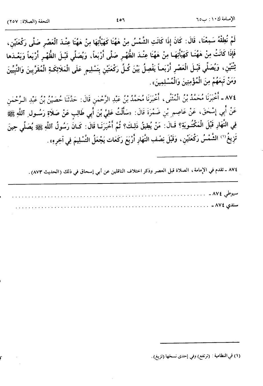874 - أَخْبَرَنَا مُحَمَّدُ بْنُ الْمُثَنَّى قَالَ حَدَّثَنَا مُحَمَّدُ بْنُ عَبْدِ الرَّحْمَنِ قَالَ حَدَّثَنَا حُصَيْنُ بْنُ عَبْدِ الرَّحْمَنِ عَنْ أَبِي إِسْحَقَ عَنْ عَاصِمِ بْنِ ضَمْرَةَ قَالَ سَأَلْتُ عَلِيَّ بْنَ أَبِي طَالِبٍ عَنْ صَلَاةِ رَسُولِ اللَّهِ صَلَّى اللَّهُ عَلَيْهِ وَسَلَّمَ فِي النَّهَارِ قَبْلَ الْمَكْتُوبَةِ قَالَ مَنْ يُطِيقُ ذَلِكَ ثُمَّ أَخْبَرَنَا قَالَ كَانَ رَسُولُ اللَّهِ صَلَّى اللَّهُ عَلَيْهِ وَسَلَّمَ يُصَلِّي حِينَ تَزِيغُ الشَّمْسُ رَكْعَتَيْنِ وَقَبْلَ نِصْفِ النَّهَارِ أَرْبَعَ رَكَعَاتٍ يَجْعَلُ التَّسْلِيمَ فِي آخِرِهِ