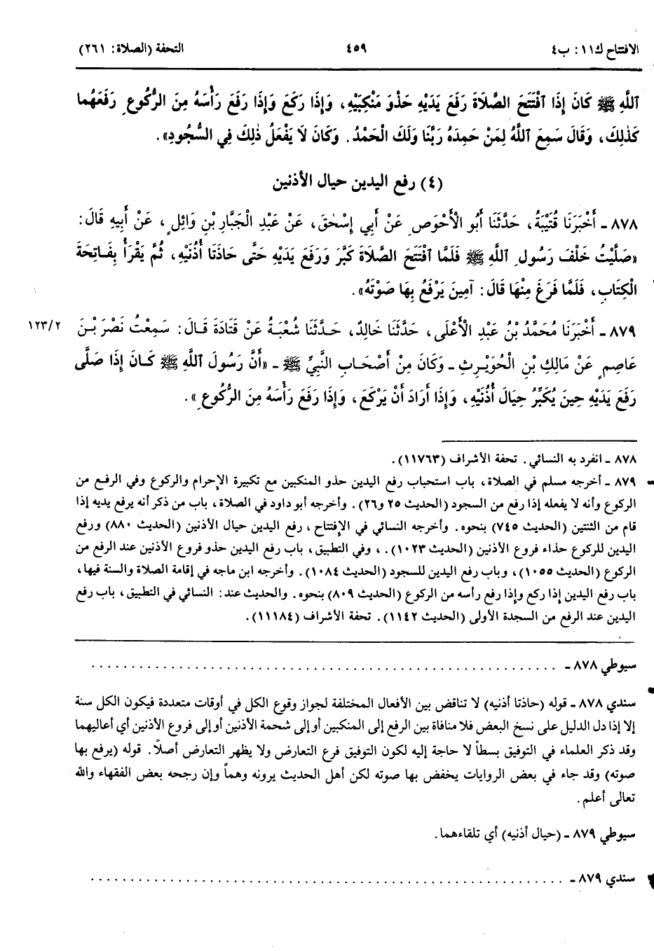 بَاب رَفْعُ الْيَدَيْنِ حِيَالَ الْأُذُنَيْنِ 878 - أَخْبَرَنَا قُتَيْبَةُ قَالَ حَدَّثَنَا أَبُو الْأَحْوَصِ عَنْ أَبِي إِسْحَقَ عَنْ عَبْدِ الْجَبَّارِ بْنِ وَائِلٍ عَنْ أَبِيهِ قَالَ صَلَّيْتُ خَلْفَ رَسُولِ اللَّهِ صَلَّى اللَّهُ عَلَيْهِ وَسَلَّمَ فَلَمَّا افْتَتَحَ الصَّلَاةَ كَبَّرَ وَرَفَعَ يَدَيْهِ حَتَّى حَاذَتَا أُذُنَيْهِ ثُمَّ يَقْرَأُ بِفَاتِحَةِ الْكِتَابِ فَلَمَّا فَرَغَ مِنْهَا قَالَ آمِينَ يَرْفَعُ بِهَا صَوْتَهُ