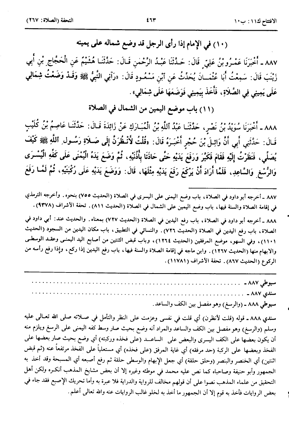 فِي الْإِمَامِ إِذَا رَأَى الرَّجُلَ قَدْ وَضَعَ شِمَالَهُ عَلَى يَمِينِهِ 887 - أَخْبَرَنَا عَمْرُو بْنُ عَلِيٍّ قَالَ حَدَّثَنَا عَبْدُ الرَّحْمَنِ قَالَ حَدَّثَنَا هُشَيْمٌ عَنْ الْحَجَّاجِ بْنِ أَبِي زَيْنَبَ قَالَ سَمِعْتُ أَبَا عُثْمَانَ يُحَدِّثُ عَنْ ابْنِ مَسْعُودٍ قَالَ رَآنِيَ النَّبِيُّ صَلَّى اللَّهُ عَلَيْهِ وَسَلَّمَ وَقَدْ وَضَعْتُ شِمَالِي عَلَى يَمِينِي فِي الصَّلَاةِ فَأَخَذَ بِيَمِينِي فَوَضَعَهَا عَلَى شِمَالِي