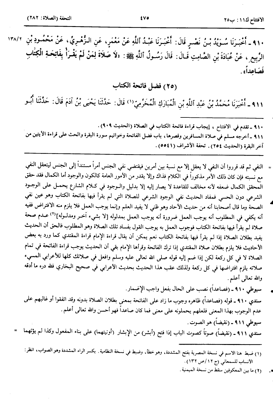910 - أَخْبَرَنَا سُوَيْدُ بْنُ نَصْرٍ قَالَ أَنْبَأَنَا عَبْدُ اللَّهِ عَنْ مَعْمَرٍ عَنْ الزُّهْرِيِّ عَنْ مَحْمُودِ بْنِ الرَّبِيعِ عَنْ عُبَادَةَ بْنِ الصَّامِتِ قَالَ قَالَ رَسُولُ اللَّهِ صَلَّى اللَّهُ عَلَيْهِ وَسَلَّمَ لَا صَلَاةَ لِمَنْ لَمْ يَقْرَأْ بِفَاتِحَةِ الْكِتَابِ فَصَاعِدًا