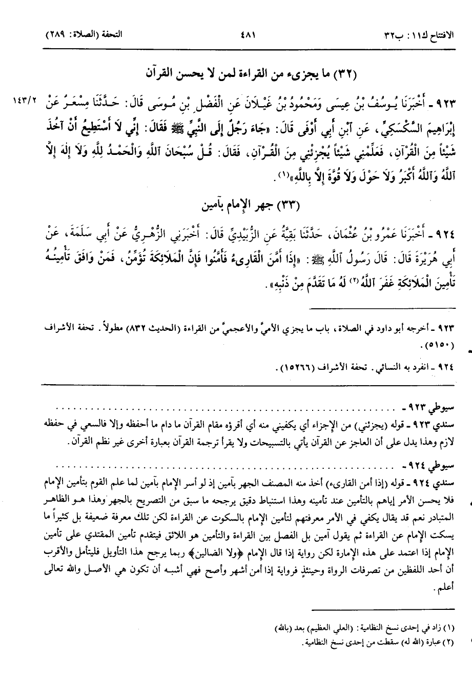 مَا يُجْزِئُ مِنْ الْقِرَاءَةِ لِمَنْ لَا يُحْسِنُ الْقُرْآنَ 923 - أَخْبَرَنَا يُوسُفُ بْنُ عِيسَى وَمَحْمُودُ بْنُ غَيْلَانَ عَنْ الْفَضْلِ بْنِ مُوسَى قَالَ حَدَّثَنَا مِسْعَرٌ عَنْ إِبْرَاهِيمَ السَّكْسَكِيِّ عَنْ ابْنِ أَبِي أَوْفَى قَالَ جَاءَ رَجُلٌ إِلَى النَّبِيِّ صَلَّى اللَّهُ عَلَيْهِ وَسَلَّمَ فَقَالَ إِنِّي لَا أَسْتَطِيعُ أَنْ آخُذَ شَيْئًا مِنْ الْقُرْآنِ فَعَلِّمْنِي شَيْئًا يُجْزِئُنِي مِنْ الْقُرْآنِ فَقَالَ قُلْ سُبْحَانَ اللَّهِ وَالْحَمْدُ لِلَّهِ وَلَا إِلَهَ إِلَّا اللَّهُ وَاللَّهُ أَكْبَرُ وَلَا حَوْلَ وَلَا قُوَّةَ إِلَّا بِاللَّهِ