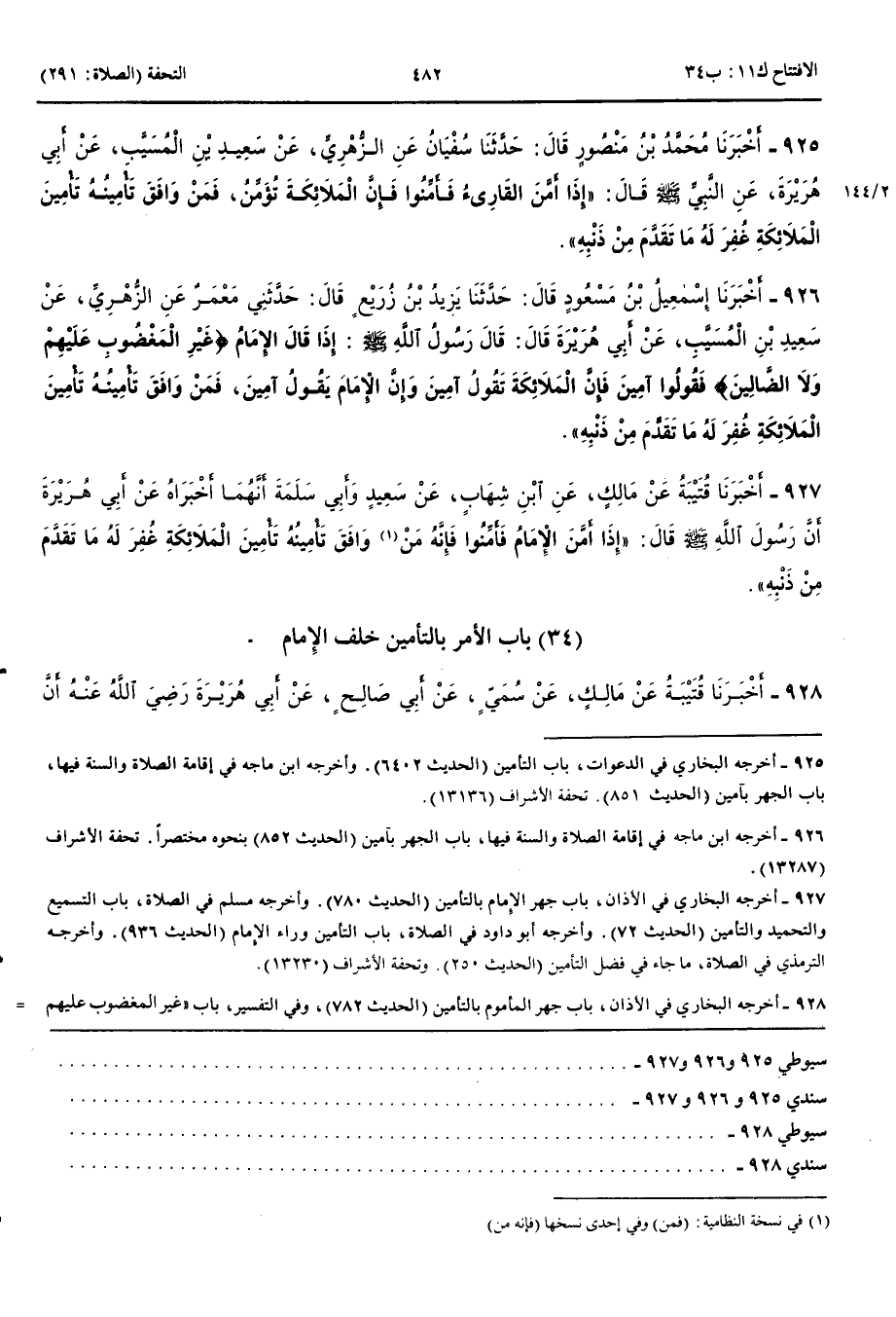 927 - أَخْبَرَنَا قُتَيْبَةُ عَنْ مَالِكٍ عَنْ ابْنِ شِهَابٍ عَنْ سَعِيدٍ وَأَبِي سَلَمَةَ أَنَّهُمَا أَخْبَرَاهُ عَنْ أَبِي هُرَيْرَةَ أَنَّ رَسُولَ اللَّهِ صَلَّى اللَّهُ عَلَيْهِ وَسَلَّمَ قَالَ إِذَا أَمَّنَ الْإِمَامُ فَأَمِّنُوا فَإِنَّهُ مَنْ وَافَقَ تَأْمِينُهُ تَأْمِينَ الْمَلَائِكَةِ غُفِرَ لَهُ مَا تَقَدَّمَ مِنْ ذَنْبِهِ