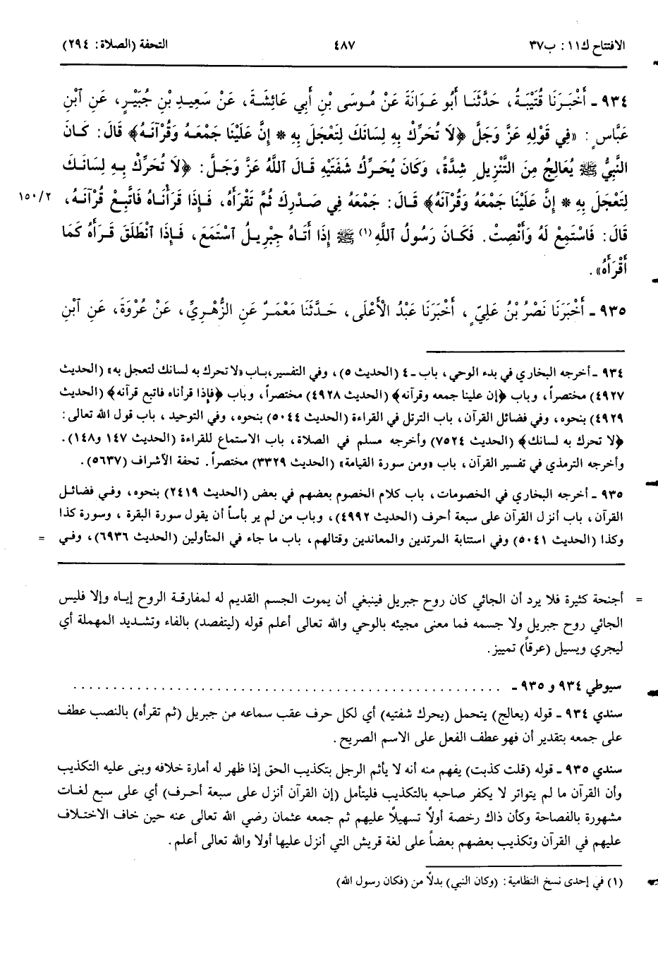 934 - أَخْبَرَنَا قُتَيْبَةُ قَالَ حَدَّثَنَا أَبُو عَوَانَةَ عَنْ مُوسَى بْنِ أَبِي عَائِشَةَ عَنْ سَعِيدِ بْنِ جُبَيْرٍ عَنْ ابْنِ عَبَّاسٍ فِي قَوْلِهِ عَزَّ وَجَلَّ {لَا تُحَرِّكْ بِهِ لِسَانَكَ لِتَعْجَلَ بِهِ إِنَّ عَلَيْنَا جَمْعَهُ وَقُرْآنَهُ} قَالَ كَانَ النَّبِيُّ صَلَّى اللَّهُ عَلَيْهِ وَسَلَّمَ يُعَالِجُ مِنْ التَّنْزِيلِ شِدَّةً وَكَانَ يُحَرِّكُ شَفَتَيْهِ قَالَ اللَّهُ عَزَّ وَجَلَّ {لَا تُحَرِّكْ بِهِ لِسَانَكَ لِتَعْجَلَ بِهِ إِنَّ عَلَيْنَا جَمْعَهُ وَقُرْآنَهُ} قَالَ جَمْعَهُ فِي صَدْرِكَ ثُمَّ تَقْرَؤُهُ {فَإِذَا قَرَأْنَاهُ فَاتَّبِعْ قُرْآنَهُ} قَالَ فَاسْتَمِعْ لَهُ وَأَنْصِتْ فَكَانَ رَسُولُ اللَّهِ صَلَّى اللَّهُ عَلَيْهِ وَسَلَّمَ إِذَا أَتَاهُ جِبْرِيلُ اسْتَمَعَ فَإِذَا انْطَلَقَ قَرَأَهُ كَمَا أَقْرَأَهُ