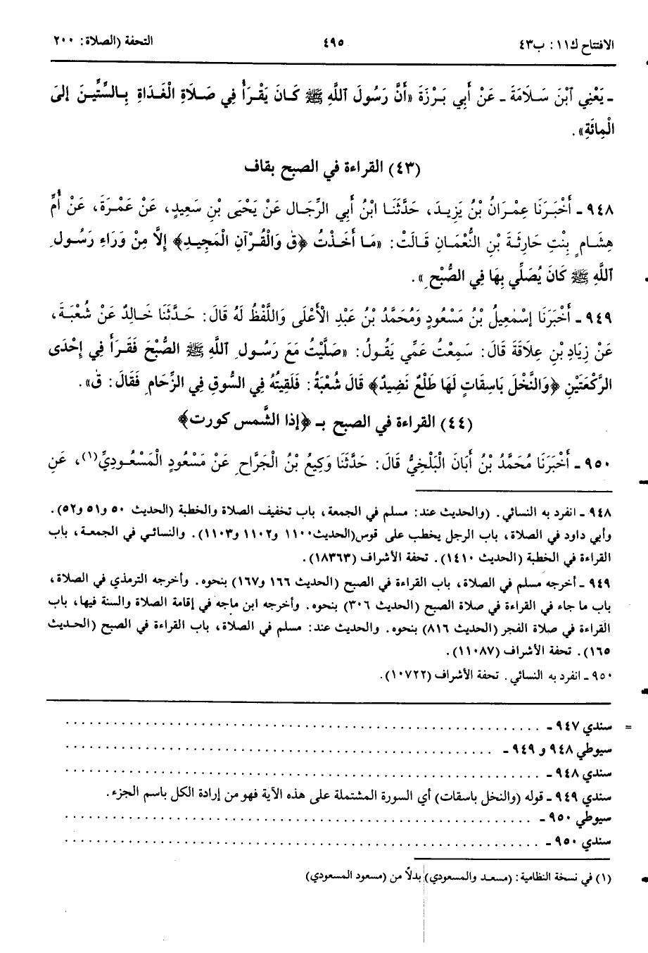 الْقِرَاءَةُ فِي الصُّبْحِ بِقَافْ 948 - أَخْبَرَنَا عِمْرَانُ بْنُ يَزِيدَ قَالَ حَدَّثَنَا ابْنُ أَبِي الرِّجَالِ عَنْ يَحْيَى بْنِ سَعِيدٍ عَنْ عَمْرَةَ عَنْ أُمِّ هِشَامٍ بِنْتِ حَارِثَةَ بْنِ النُّعْمَانِ قَالَتْ مَا أَخَذْتُ ق وَالْقُرْآنِ الْمَجِيدِ إِلَّا مِنْ وَرَاءِ رَسُولِ اللَّهِ صَلَّى اللَّهُ عَلَيْهِ وَسَلَّمَ كَانَ يُصَلِّي بِهَا فِي الصُّبْحِ