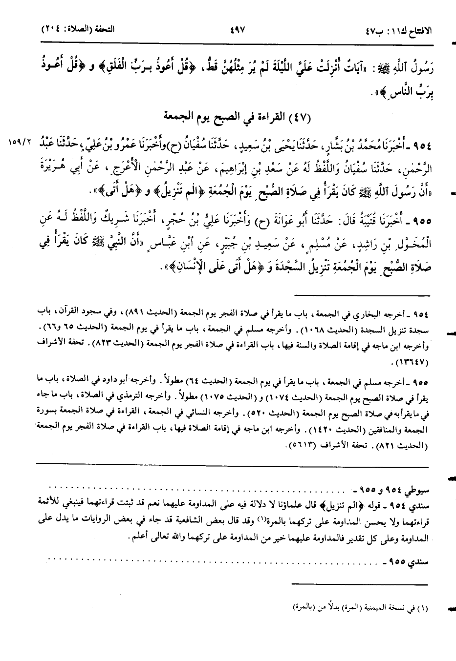 955 - أَخْبَرَنَا قُتَيْبَةُ قَالَ حَدَّثَنَا أَبُو عَوَانَةَ ح و أَخْبَرَنَا عَلِيُّ بْنُ حُجْرٍ قَالَ أَنْبَأَنَا شَرِيكٌ وَاللَّفْظُ لَهُ عَنْ الْمُخَوَّلِ بْنِ رَاشِدٍ عَنْ مُسْلِمٍ عَنْ سَعِيدِ بْنِ جُبَيْرٍ عَنْ ابْنِ عَبَّاسٍ أَنَّ النَّبِيَّ صَلَّى اللَّهُ عَلَيْهِ وَسَلَّمَ كَانَ يَقْرَأُ فِي صَلَاةِ الصُّبْحِ يَوْمَ الْجُمُعَةِ تَنْزِيلُ السَّجْدَةَ وَهَلْ أَتَى عَلَى الْإِنْسَانِ