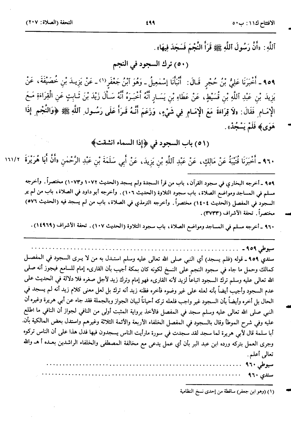 تَرْكُ السُّجُودِ فِي النَّجْمِ 959 - أَخْبَرَنَا عَلِيُّ بْنُ حُجْرٍ قَالَ أَنْبَأَنَا إِسْمَعِيلُ وَهُوَ ابْنُ جَعْفَرٍ عَنْ يَزِيدَ بْنِ خُصَيْفَةَ عَنْ يَزِيدَ بْنِ عَبْدِ اللَّهِ بْنِ قُسَيْطٍ عَنْ عَطَاءِ بْنِ يَسَارٍ أَنَّهُ سَأَلَ زَيْدَ بْنَ ثَابِتٍ عَنْ الْقِرَاءَةِ مَعَ الْإِمَامِ فَقَالَ لَا قِرَاءَةَ مَعَ الْإِمَامِ فِي شَيْءٍ وَزَعَمَ أَنَّهُ قَرَأَ عَلَى رَسُولِ اللَّهِ صَلَّى اللَّهُ عَلَيْهِ وَسَلَّمَ وَالنَّجْمِ إِذَا هَوَى فَلَمْ يَسْجُدْ