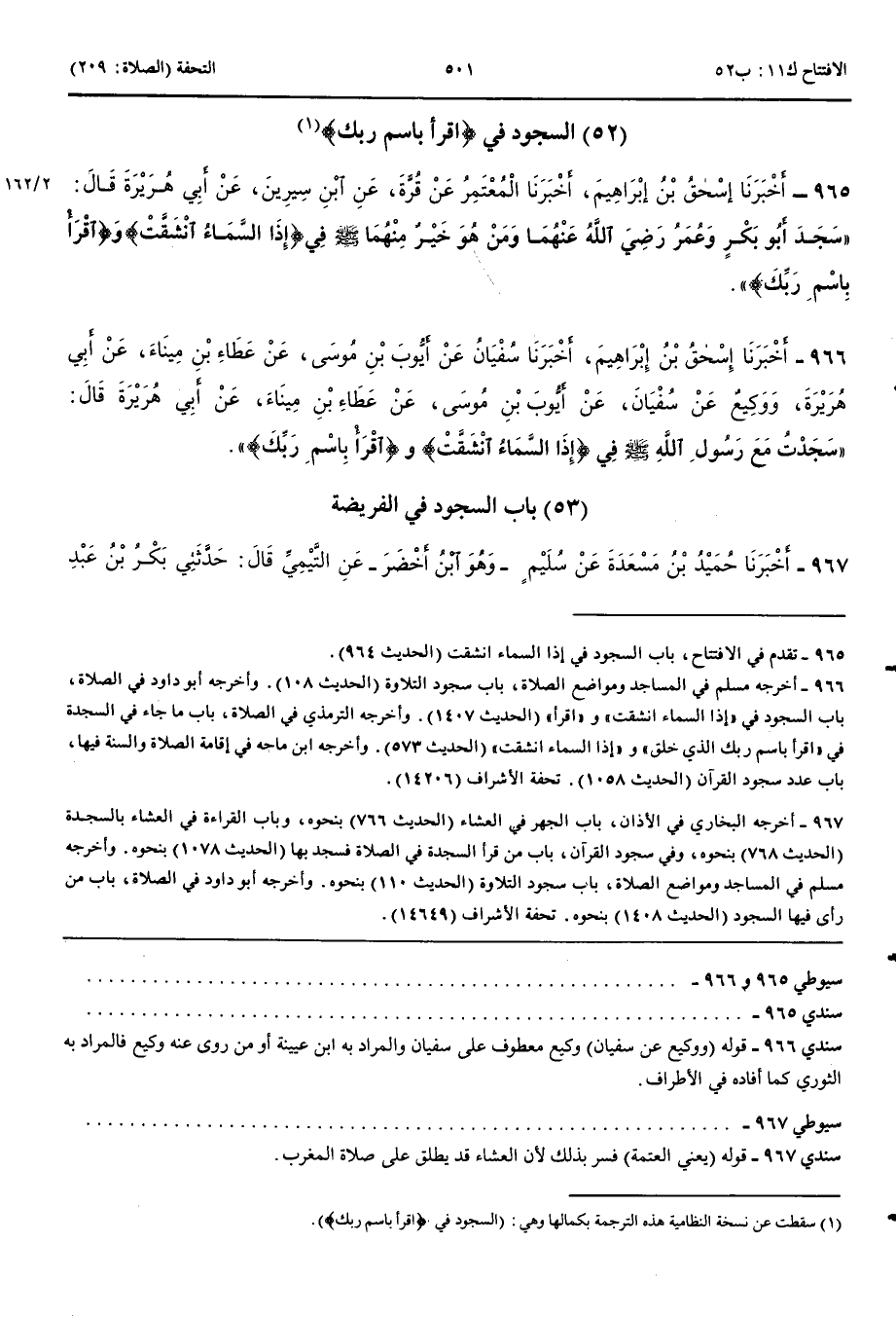 السُّجُودُ فِي اقْرَأْ بِاسْمِ رَبِّكَ 965 - أَخْبَرَنَا إِسْحَقُ بْنُ إِبْرَاهِيمَ قَالَ أَنْبَأَنَا الْمُعْتَمِرُ عَنْ قُرَّةَ عَنْ ابْنِ سِيرِينَ عَنْ أَبِي هُرَيْرَةَ قَالَ سَجَدَ أَبُو بَكْرٍ وَعُمَرُ رَضِيَ اللَّهُ عَنْهُمَا وَمَنْ هُوَ خَيْرٌ مِنْهُمَا صَلَّى اللَّهُ عَلَيْهِ وَسَلَّمَ فِي إِذَا السَّمَاءُ انْشَقَّتْ وَاقْرَأْ بِاسْمِ رَبِّكَ