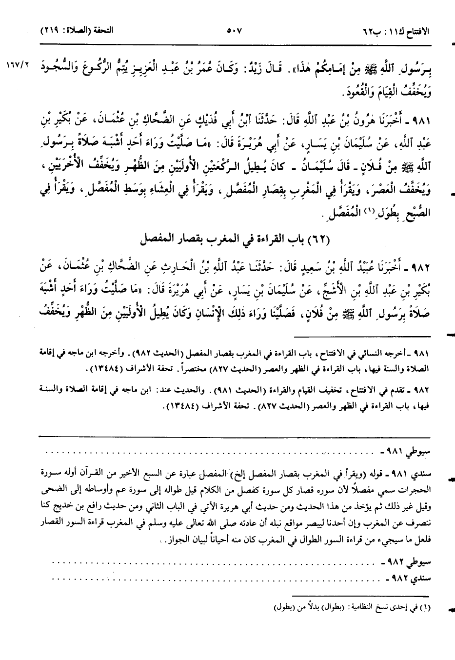 بَاب الْقِرَاءَةِ فِي الْمَغْرِبِ بِقِصَارِ الْمُفَصَّلِ 982 - أَخْبَرَنَا عُبَيْدُ اللَّهِ بْنُ سَعِيدٍ قَالَ حَدَّثَنَا عَبْدُ اللَّهِ بْنُ الْحَارِثِ عَنْ الضَّحَّاكِ بْنِ عُثْمَانَ عَنْ بُكَيْرِ بْنِ عَبْدِ اللَّهِ بْنِ الْأَشَجِّ عَنْ سُلَيْمَانَ بْنِ يَسَارٍ عَنْ أَبِي هُرَيْرَةَ قَالَ مَا صَلَّيْتُ وَرَاءَ أَحَدٍ أَشْبَهَ صَلَاةً بِرَسُولِ اللَّهِ صَلَّى اللَّهُ عَلَيْهِ وَسَلَّمَ مِنْ فُلَانٍ فَصَلَّيْنَا وَرَاءَ ذَلِكَ الْإِنْسَانِ وَكَانَ يُطِيلُ الْأُولَيَيْنِ مِنْ الظُّهْرِ وَيُخَفِّفُ فِي الْأُخْرَيَيْنِ وَيُخَفِّفُ فِي الْعَصْرِ وَيَقْرَأُ فِي الْمَغْرِبِ بِقِصَارِ الْمُفَصَّلِ وَيَقْرَأُ فِي الْعِشَاءِ بِالشَّمْسِ وَضُحَاهَا وَأَشْبَاهِهَا وَيَقْرَأُ فِي الصُّبْحِ بِسُورَتَيْنِ طَوِيلَتَيْنِ