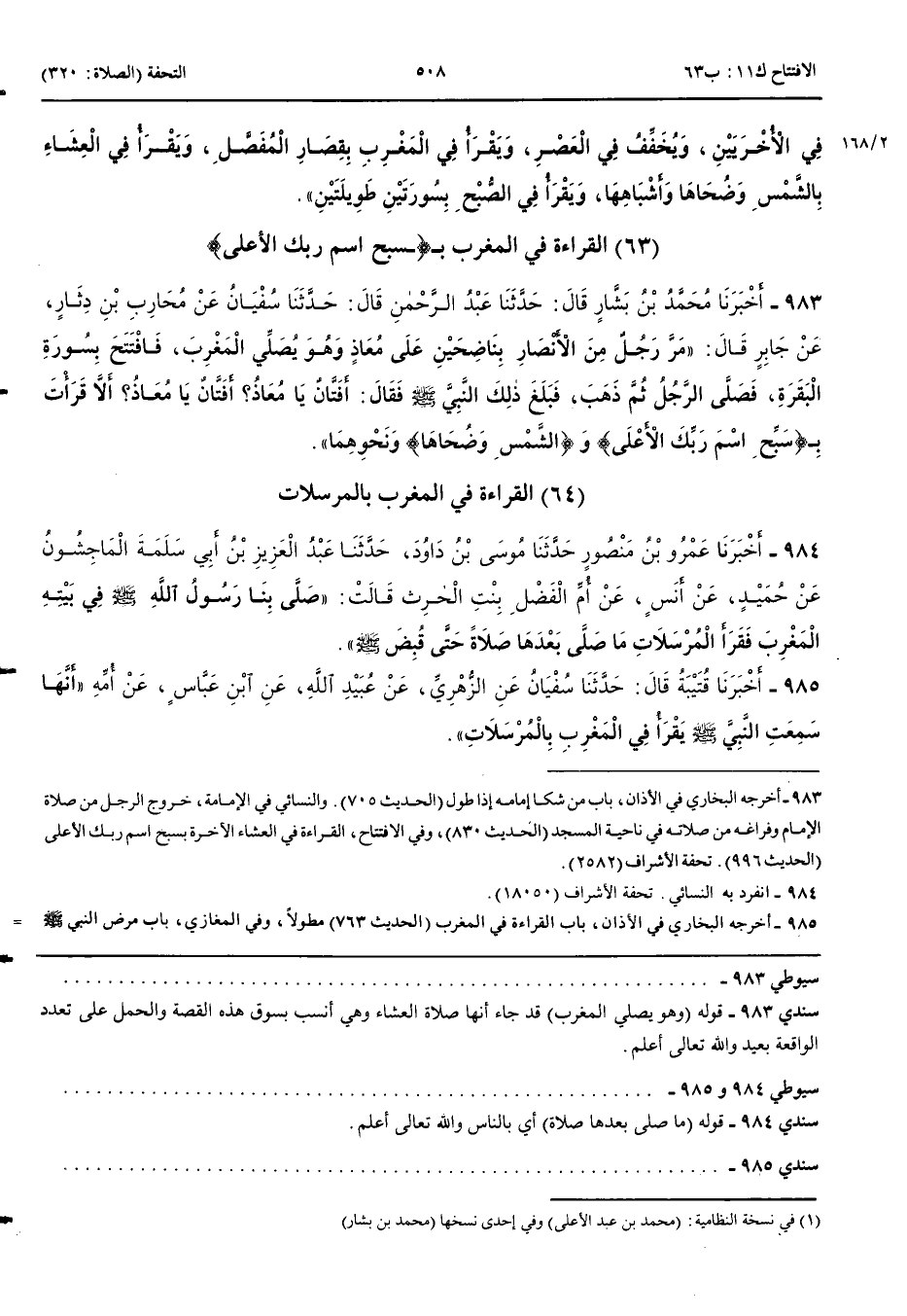 الْقِرَاءَةُ فِي الْمَغْرِبِ بِسَبِّحِ اسْمَ رَبِّكَ الْأَعْلَى 983 - أَخْبَرَنَا مُحَمَّدُ بْنُ بَشَّارٍ قَالَ حَدَّثَنَا عَبْدُ الرَّحْمَنِ قَالَ حَدَّثَنَا سُفْيَانُ عَنْ مُحَارِبِ بْنِ دِثَارٍ عَنْ جَابِرٍ قَالَ مَرَّ رَجُلٌ مِنْ الْأَنْصَارِ بِنَاضِحَيْنِ عَلَى مُعَاذٍ وَهُوَ يُصَلِّي الْمَغْرِبَ فَافْتَتَحَ بِسُورَةِ الْبَقَرَةِ فَصَلَّى الرَّجُلُ ثُمَّ ذَهَبَ فَبَلَغَ ذَلِكَ النَّبِيَّ صَلَّى اللَّهُ عَلَيْهِ وَسَلَّمَ فَقَالَ أَفَتَّانٌ يَا مُعَاذُ أَفَتَّانٌ يَا مُعَاذُ أَلَّا قَرَأْتَ بِسَبِّحِ اسْمَ رَبِّكَ الْأَعْلَى وَالشَّمْسِ وَضُحَاهَا وَنَحْوِهِمَا