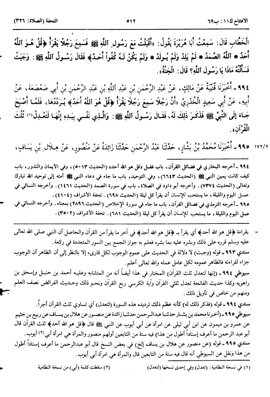 994 - أَخْبَرَنَا قُتَيْبَةُ عَنْ مَالِكٍ عَنْ عَبْدِ الرَّحْمَنِ بْنِ عَبْدِ اللَّهِ بْنِ عَبْدِ الرَّحْمَنِ بْنِ أَبِي صَعْصَعَةَ عَنْ أَبِيهِ عَنْ أَبِي سَعِيدٍ الْخُدْرِيِّ أَنَّ رَجُلًا سَمِعَ رَجُلًا يَقْرَأُ قُلْ هُوَ اللَّهُ أَحَدٌ يُرَدِّدُهَا فَلَمَّا أَصْبَحَ جَاءَ إِلَى النَّبِيِّ صَلَّى اللَّهُ عَلَيْهِ وَسَلَّمَ فَذَكَرَ ذَلِكَ لَهُ فَقَالَ رَسُولُ اللَّهِ صَلَّى اللَّهُ عَلَيْهِ وَسَلَّمَ وَالَّذِي نَفْسِي بِيَدِهِ إِنَّهَا لَتَعْدِلُ ثُلُثَ الْقُرْآنِ