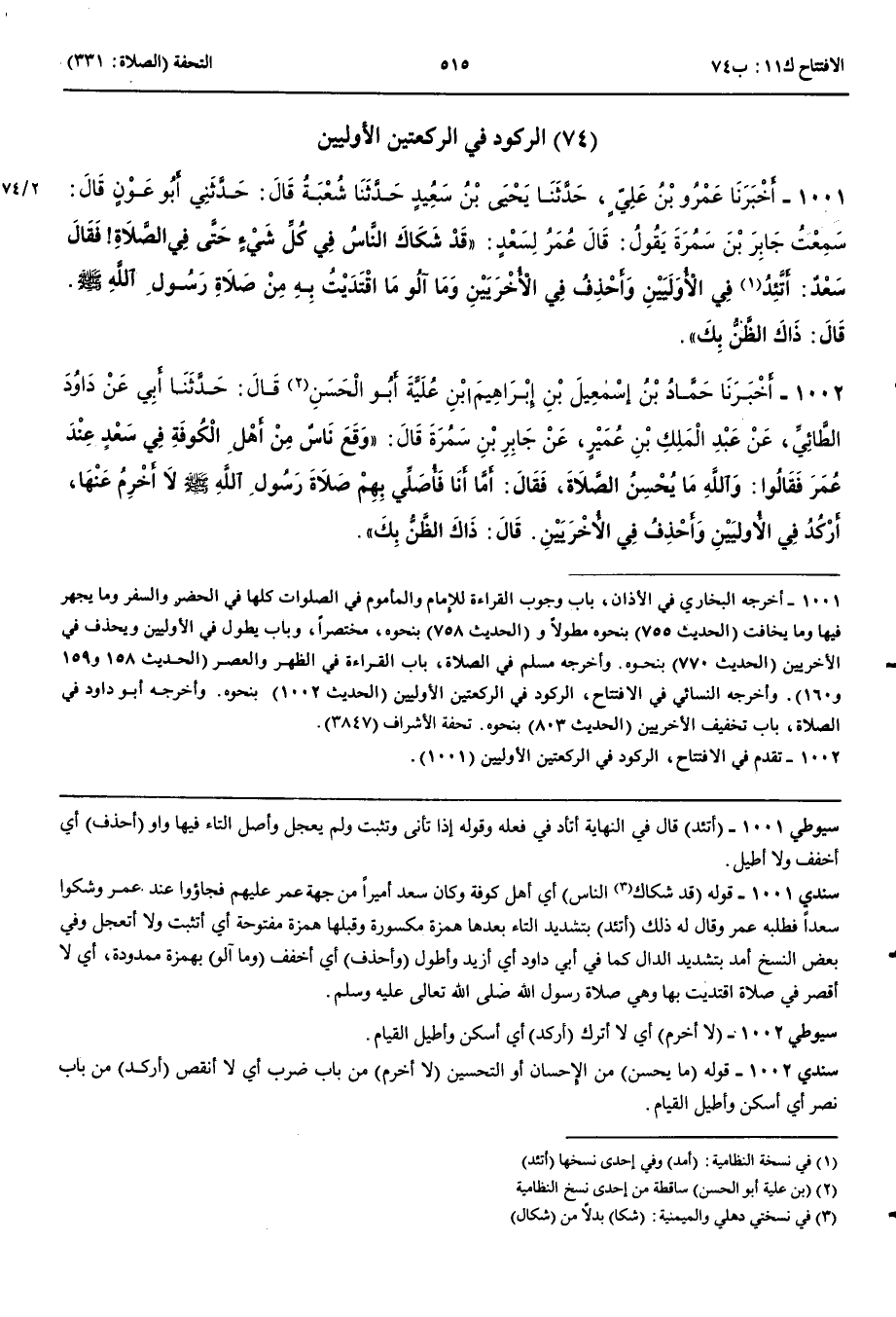 الرُّكُودُ فِي الرَّكْعَتَيْنِ الْأُولَيَيْنِ 1001 - أَخْبَرَنَا عَمْرُو بْنُ عَلِيٍّ قَالَ حَدَّثَنَا يَحْيَى بْنُ سَعِيدٍ قَالَ حَدَّثَنَا شُعْبَةُ قَالَ حَدَّثَنِي أَبُو عَوْنٍ قَالَ سَمِعْتُ جَابِرَ بْنَ سَمُرَةَ يَقُولُ قَالَ عُمَرُ لِسَعْدٍ قَدْ شَكَاكَ النَّاسُ فِي كُلِّ شَيْءٍ حَتَّى فِي الصَّلَاةِ فَقَالَ سَعْدٌ أَتَّئِدُ فِي الْأُولَيَيْنِ وَأَحْذِفُ فِي الْأُخْرَيَيْنِ وَمَا آلُو مَا اقْتَدَيْتُ بِهِ مِنْ صَلَاةِ رَسُولِ اللَّهِ صَلَّى اللَّهُ عَلَيْهِ وَسَلَّمَ قَالَ ذَاكَ الظَّنُّ بِكَ